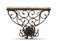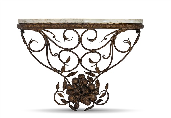 Console a goccia in ferro battuto, traforato, volute fogliate e piano in marmo