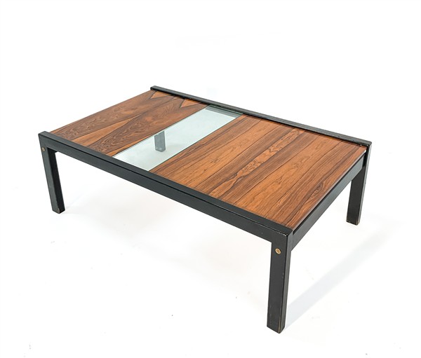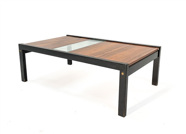 Tavolino da caffè modello "T68". Produzione Tecno, Varedo, anni '60. Legno massello e verniciato nero con fascia in vetro. (cm 122x41x75) (difetti e restauri)
