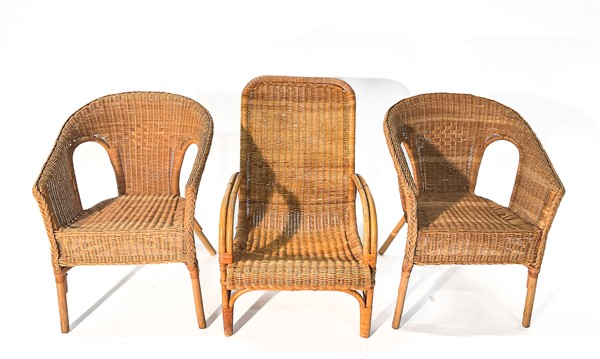 Lotto composto da una sedia da riposo e una coppia di poltroncine a pozzetto in giunco. Italia, anni '60/'80. (difetti)