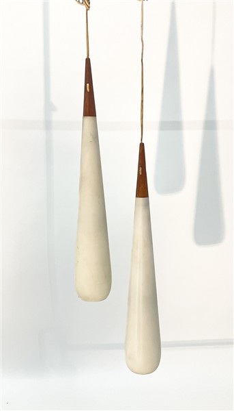 Coppia di lampade a sospensione in vetro incamiciato lattimo acidato sulla superficie esterna con montatura in legno di teak. Svezia, anni '60/'70. (diffusore h cm 71)