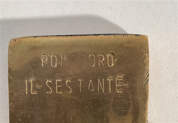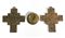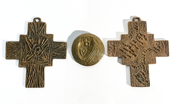 Due croci in fusione di ottone della serie "Il Sestante" e un tondo fermacarte. (l max cm 14)