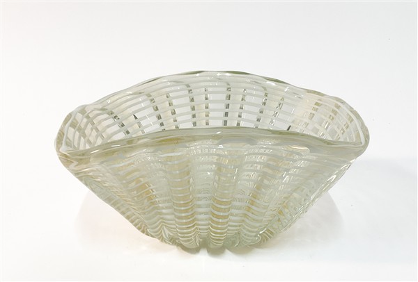 Centrotavola con bocca squadrata in vetro soffiato costolato cristallo a canne lattimo con inclusione di foglia d'oro. Seconda metà secolo XX. (cm 26,5x14x21,5)