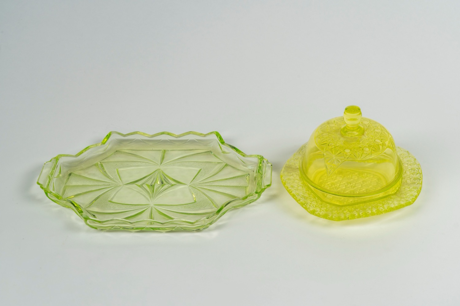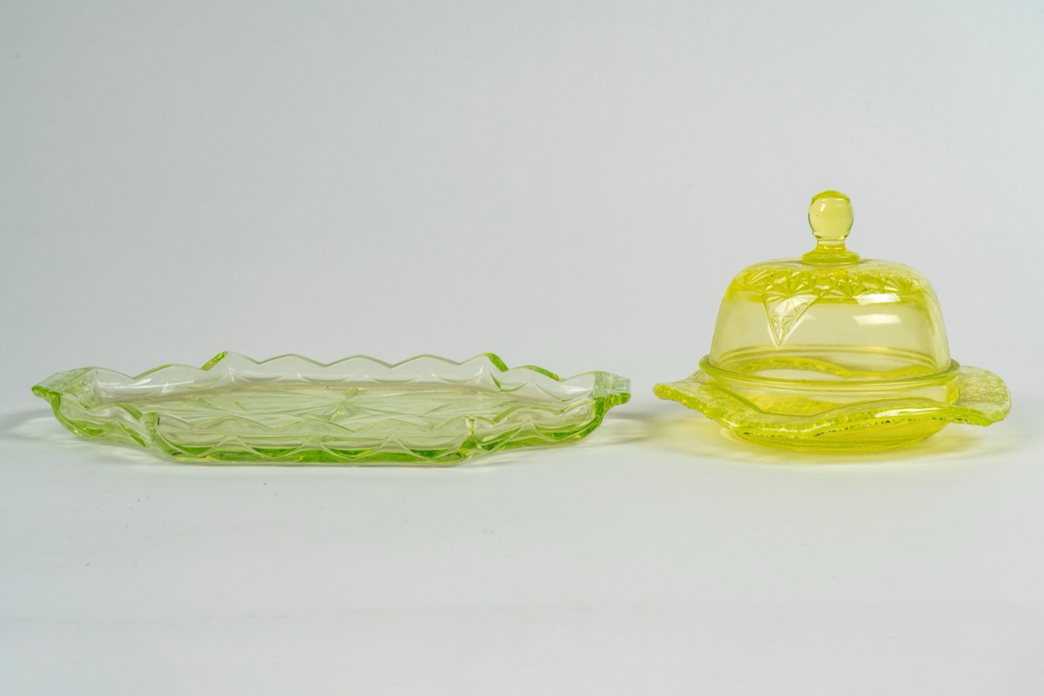 Lot 3 | Lotto composto da un vassoio biansato di forma mossa e una burriera con coperchio in vetro verde uranio