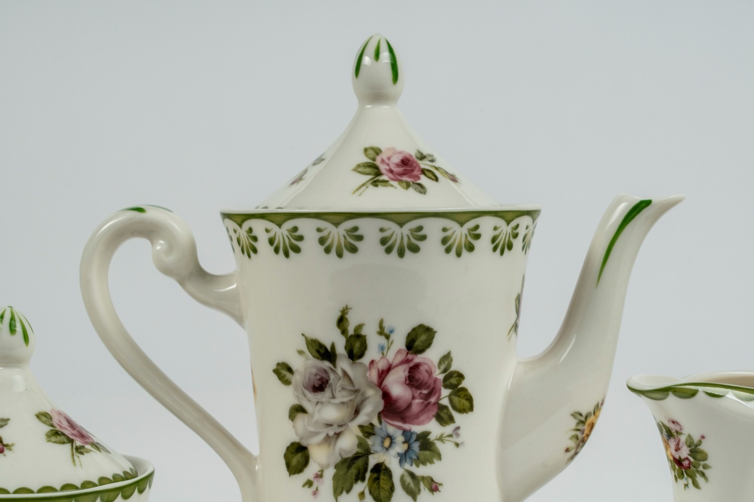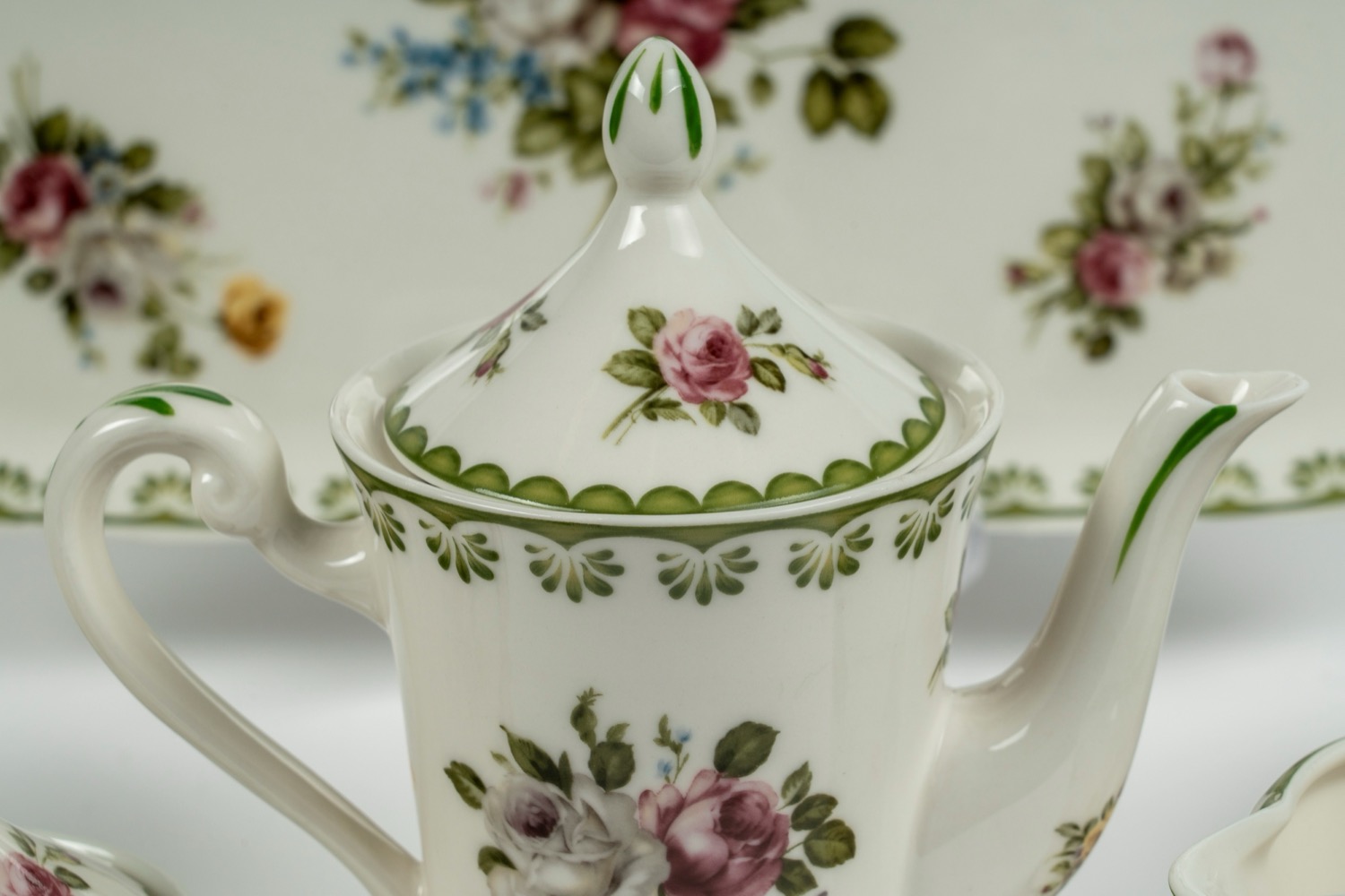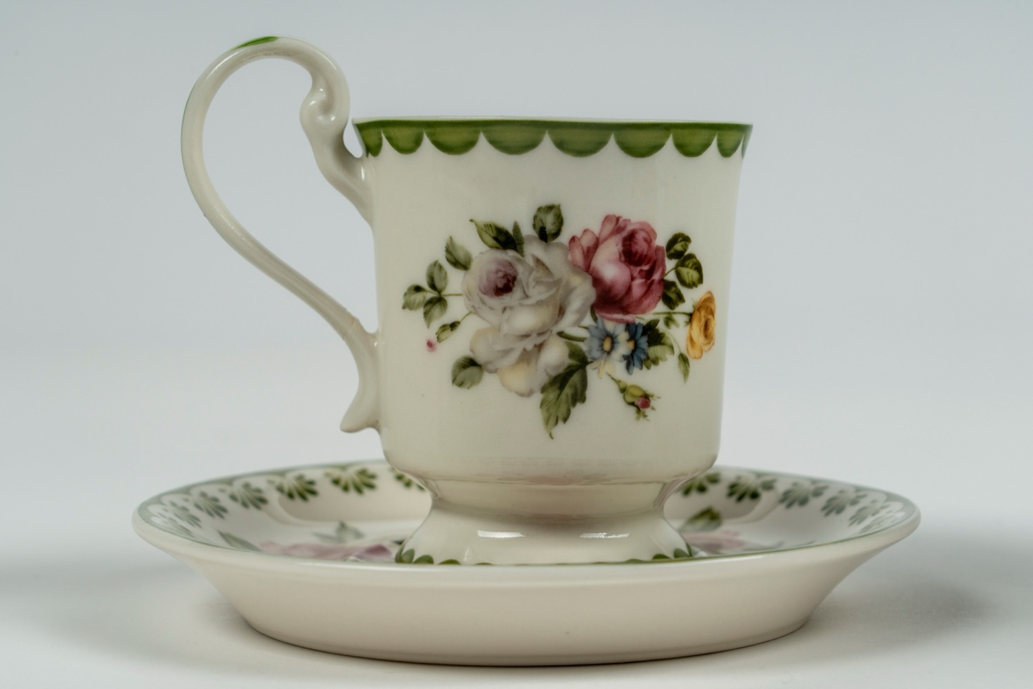 Servizio tête-à-tête da caffè in porcellana a decoro floreale di gusto vittoriano, William Collection.