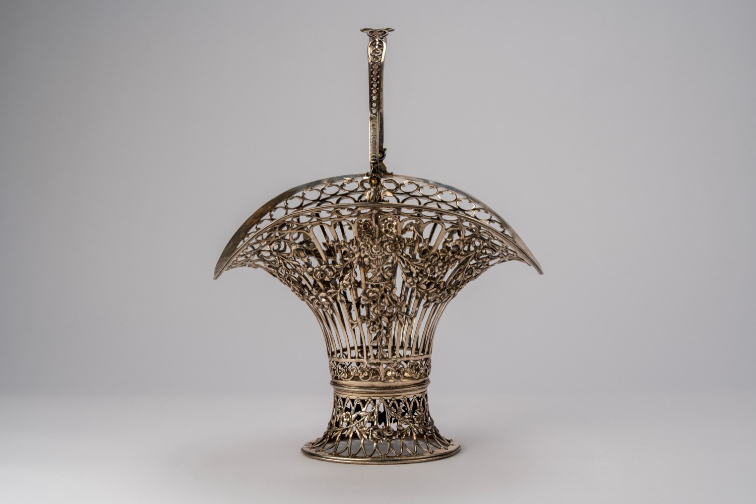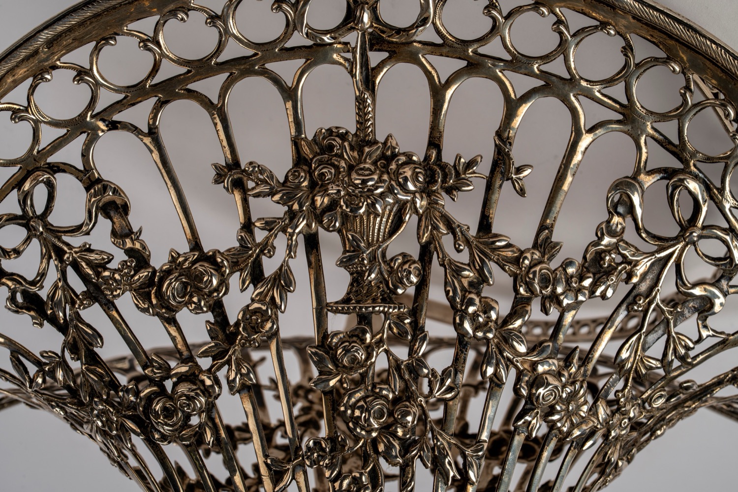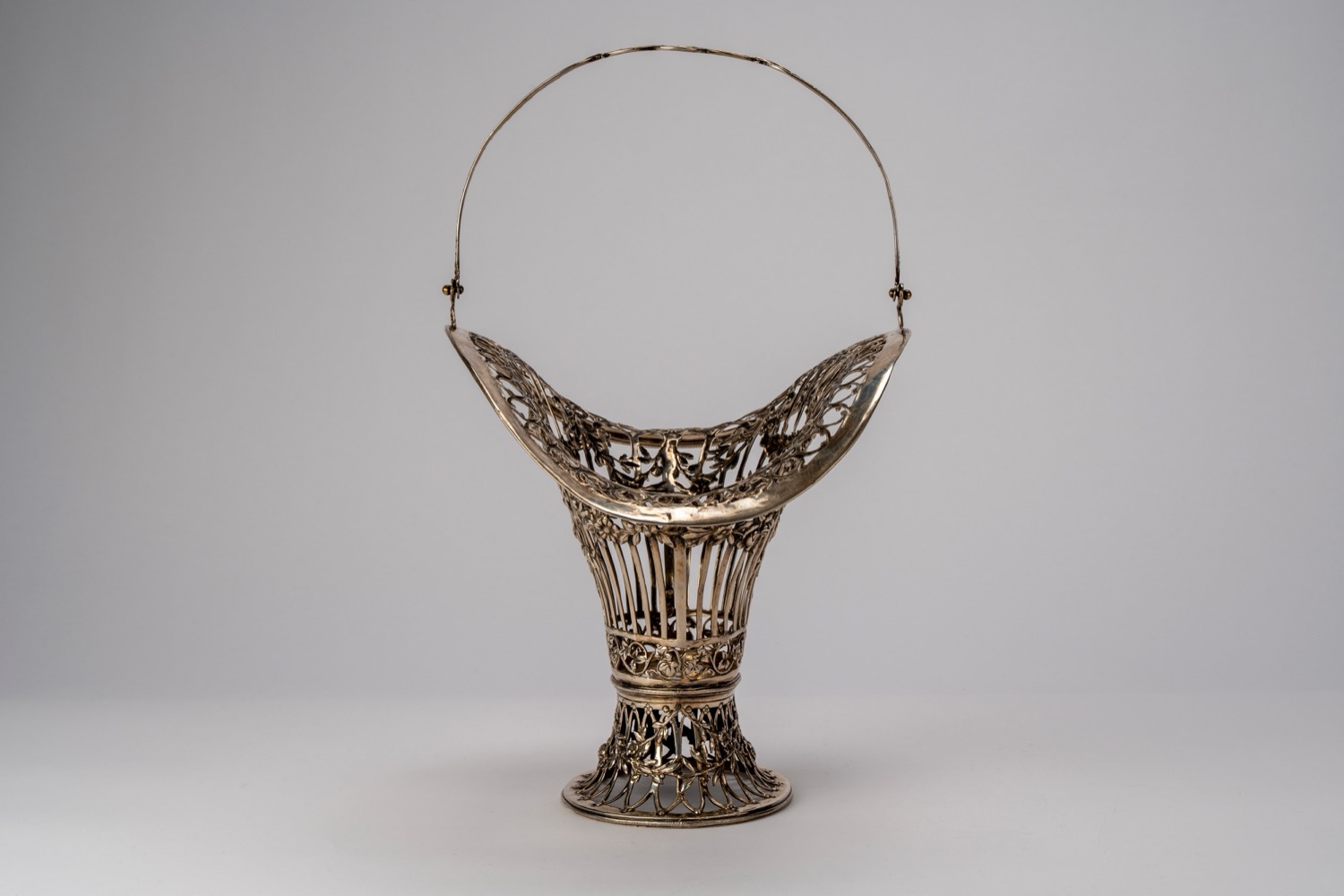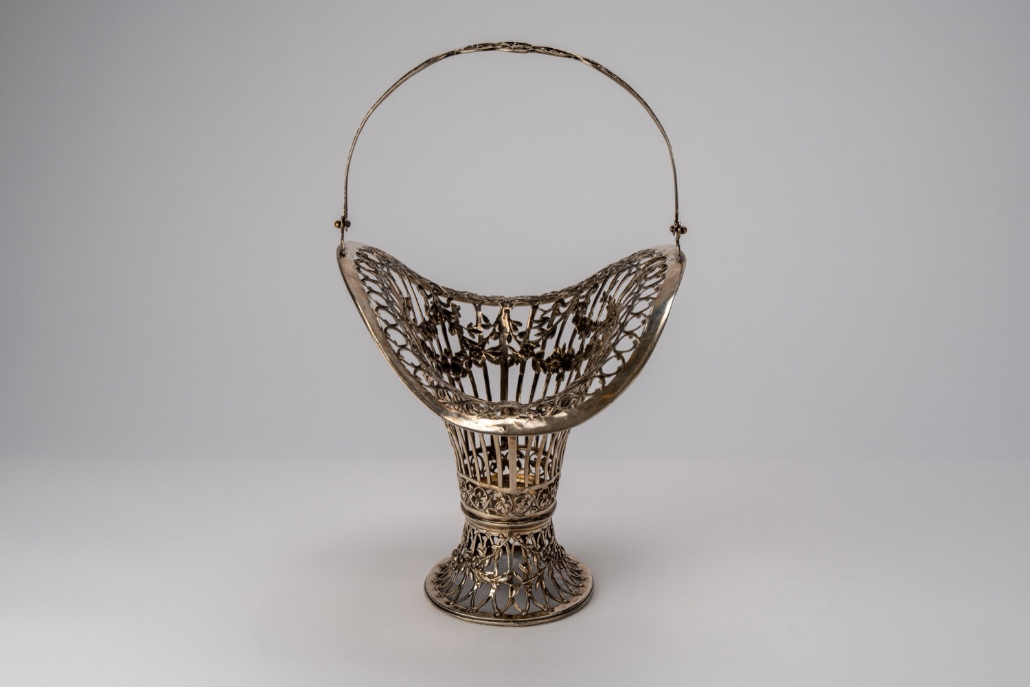 di forma mossa con corpo traforato a listelli e decorato con sbalzi di festoni e vasi floreali, presa curva e traforata.