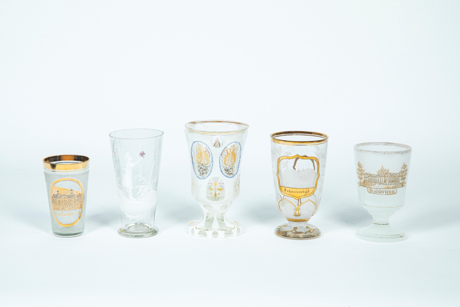 Cinque bicchieri in vetro e cristallo trasparente e bianco decorato a dorature con soggetti differenti, late 19th century-early 20th century