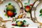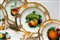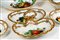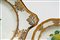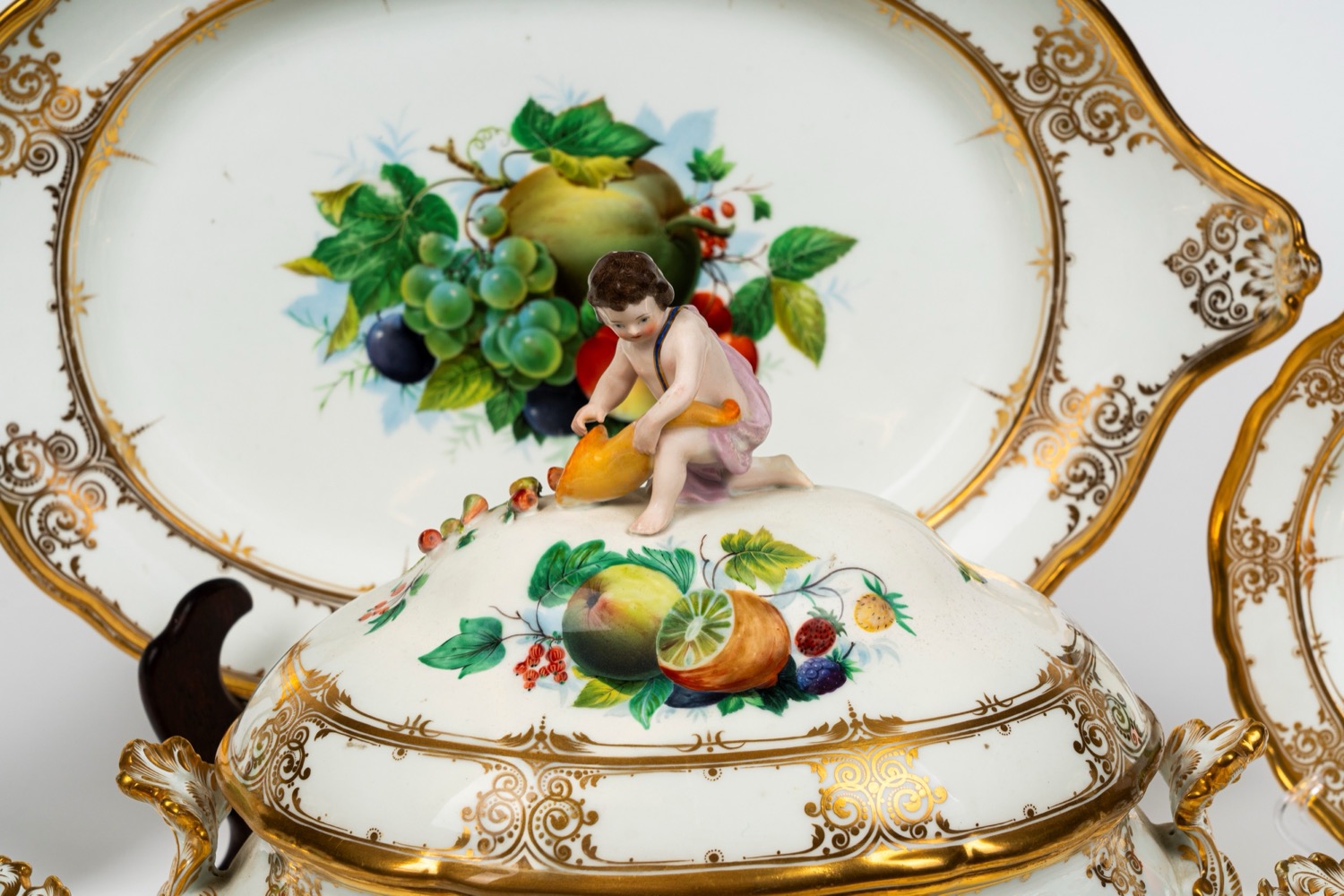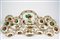 composto da 23 pezzi: 6 piatti piani, 6 piatti fondi, 6 piattini, 1 grande zuppiera biansata e altre due di dimensioni minori corredate da coperchi con prese plastiche modellate a forma di putti, un grande vassoio ovale e un vassoio con doppia valva. Lievi usure alla doratura e alla policromia. Lievi felature, sbeccature e mancanze alle foglioline applicate.
