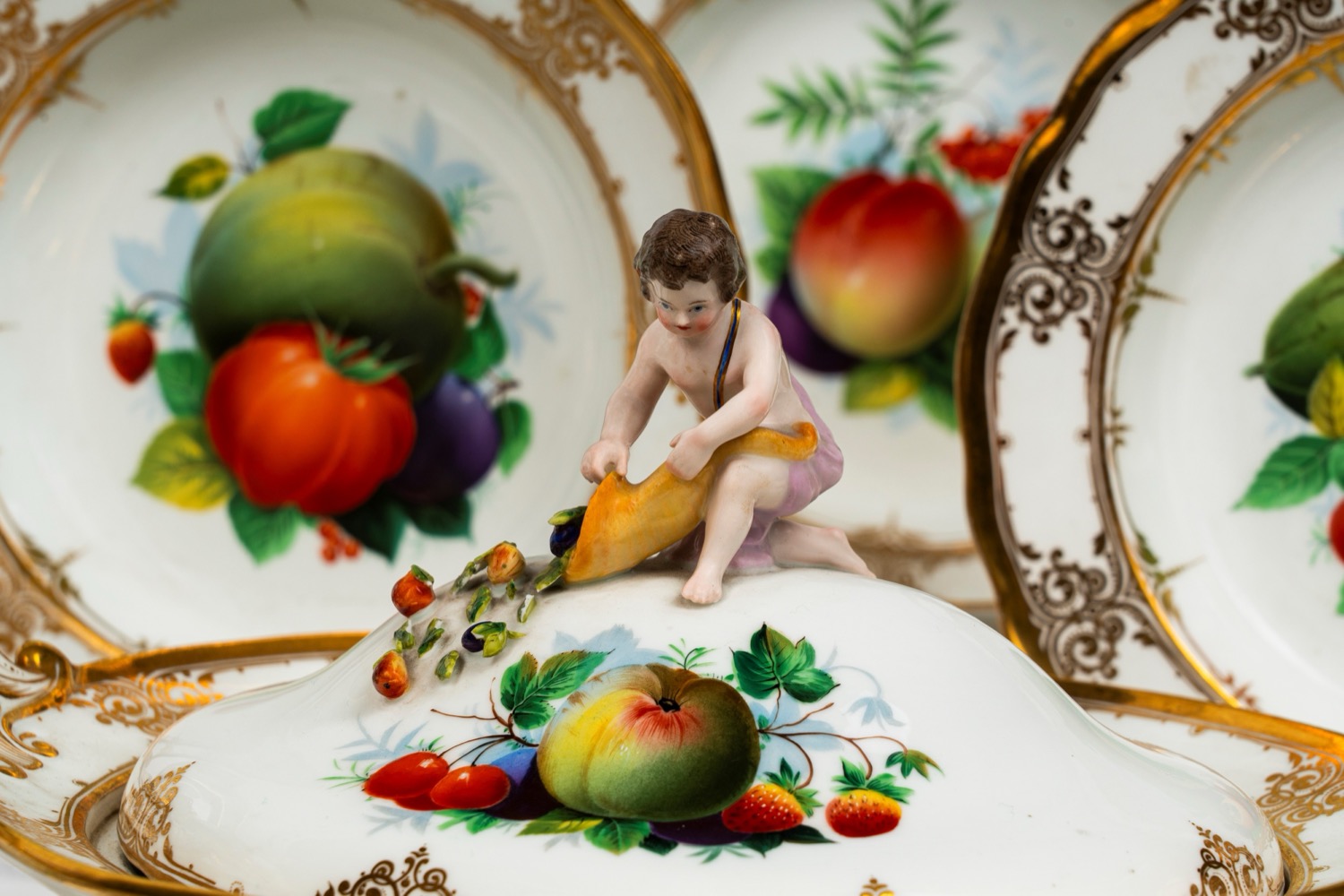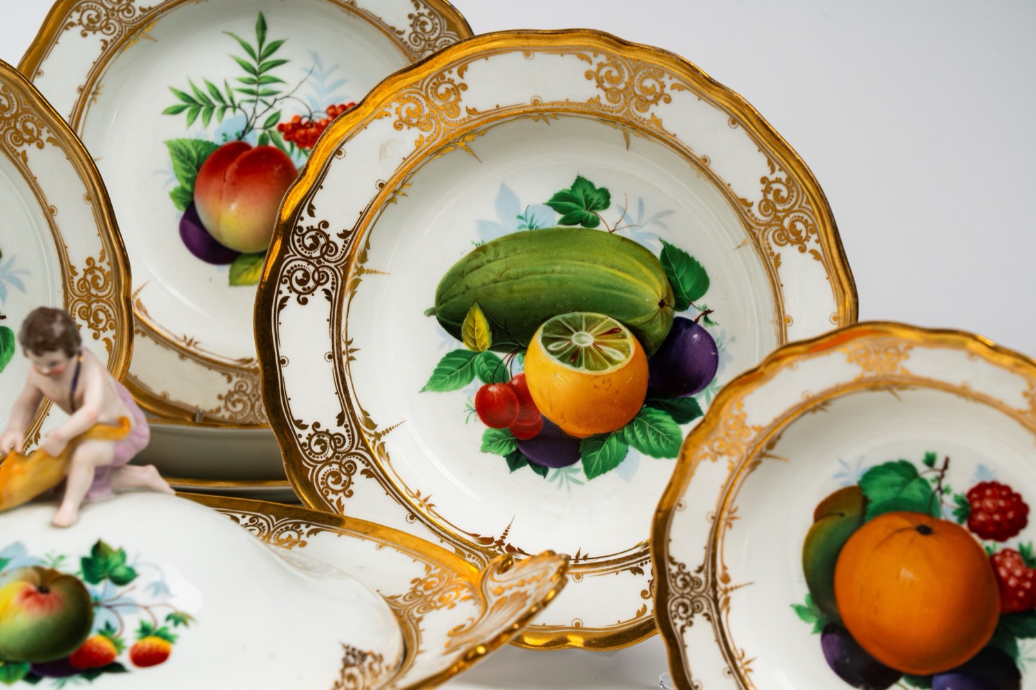 Lotto accompagnato da attestato di libera circolazione n. 10394 del 3/06/2021.composto da 23 pezzi: 6 piatti piani, 6 piatti fondi, 6 piattini, 1 grande zuppiera biansata e altre due di dimensioni minori corredate da coperchi con prese plastiche modellate a forma di putti, un grande vassoio ovale e un vassoio con doppia valva. Lievi usure alla doratura e alla policromia. Lievi felature, sbeccature e mancanze alle foglioline applicate.