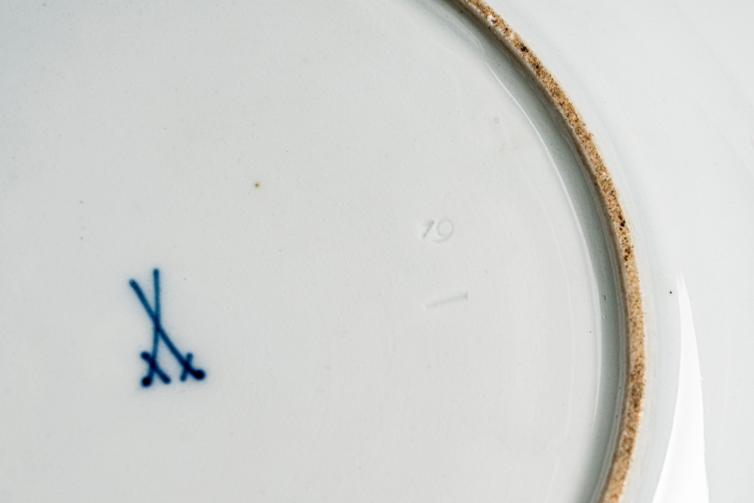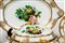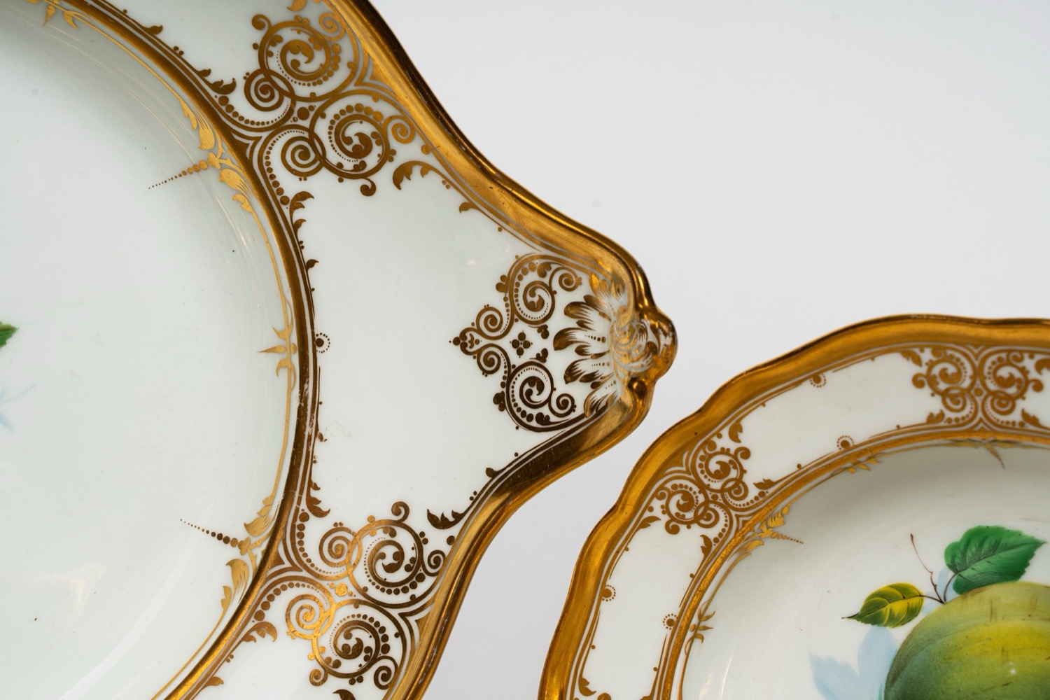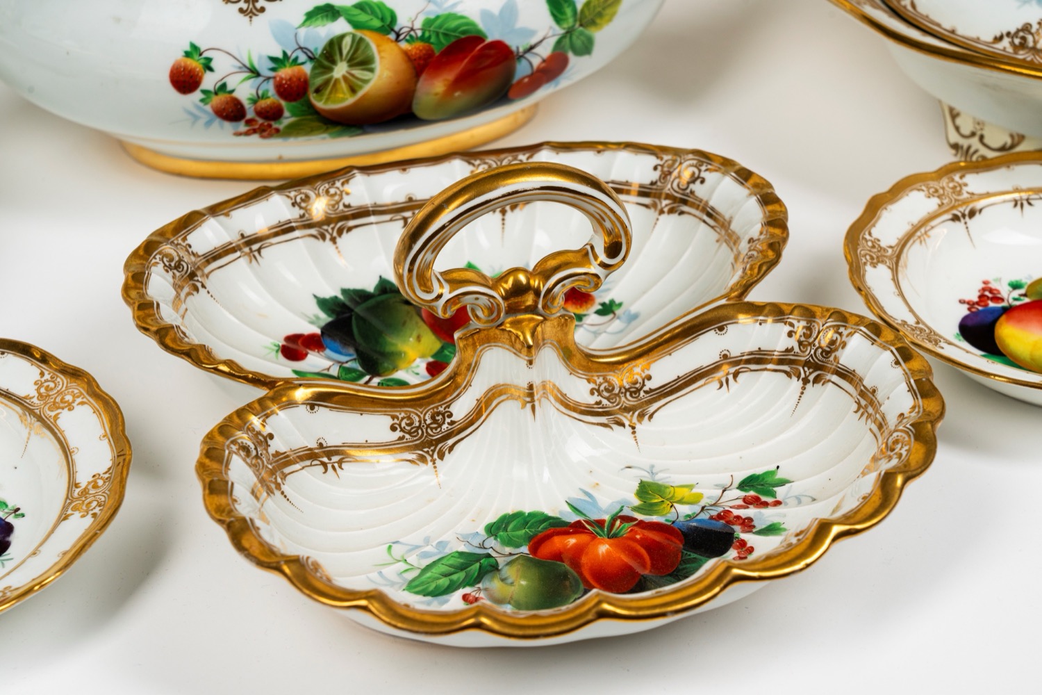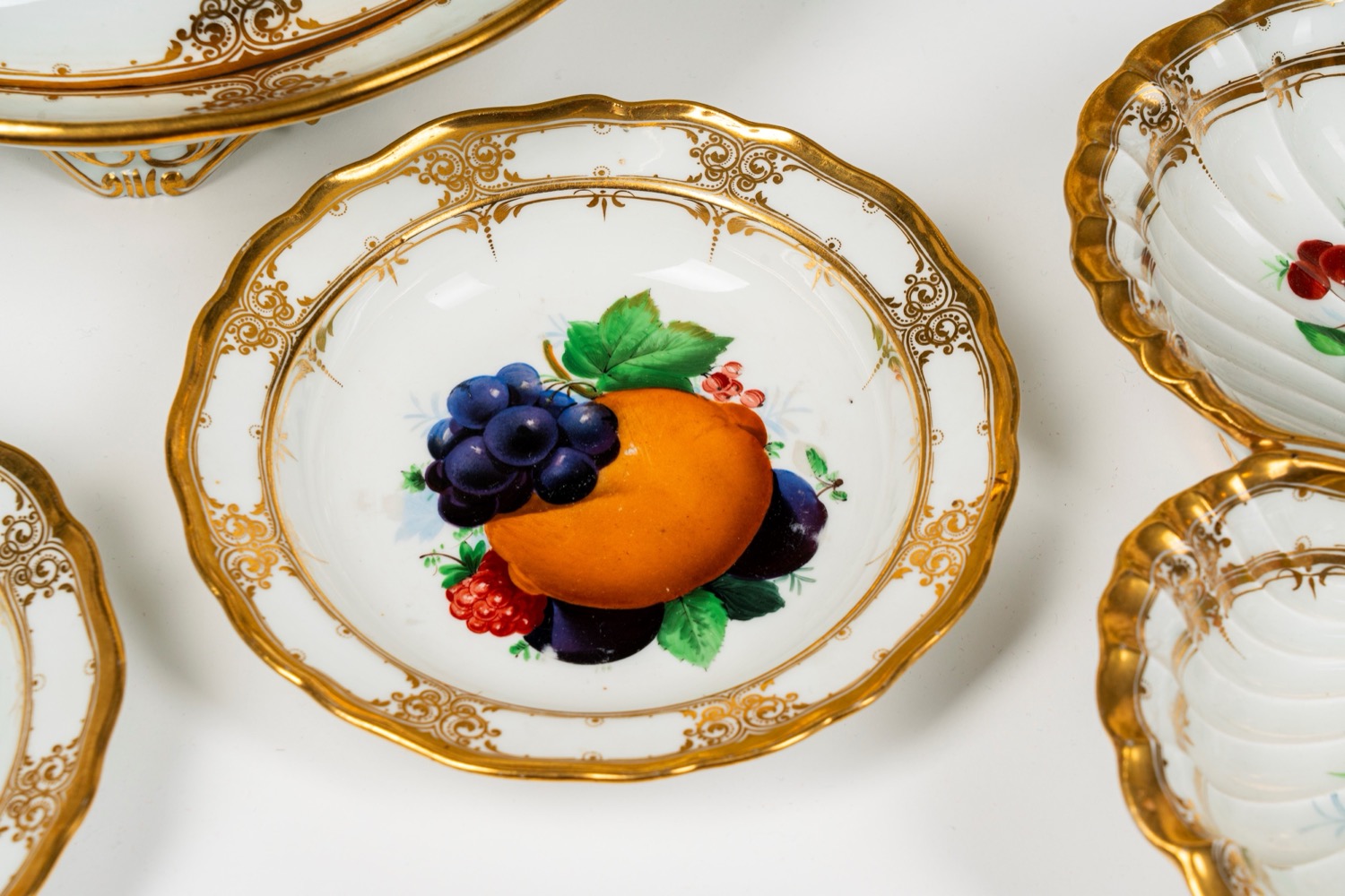 Importante servizio in porcellana bianca a bordo mosso e dorato finemente decorato a frutti. Meissen, inizi del XIX secolo