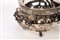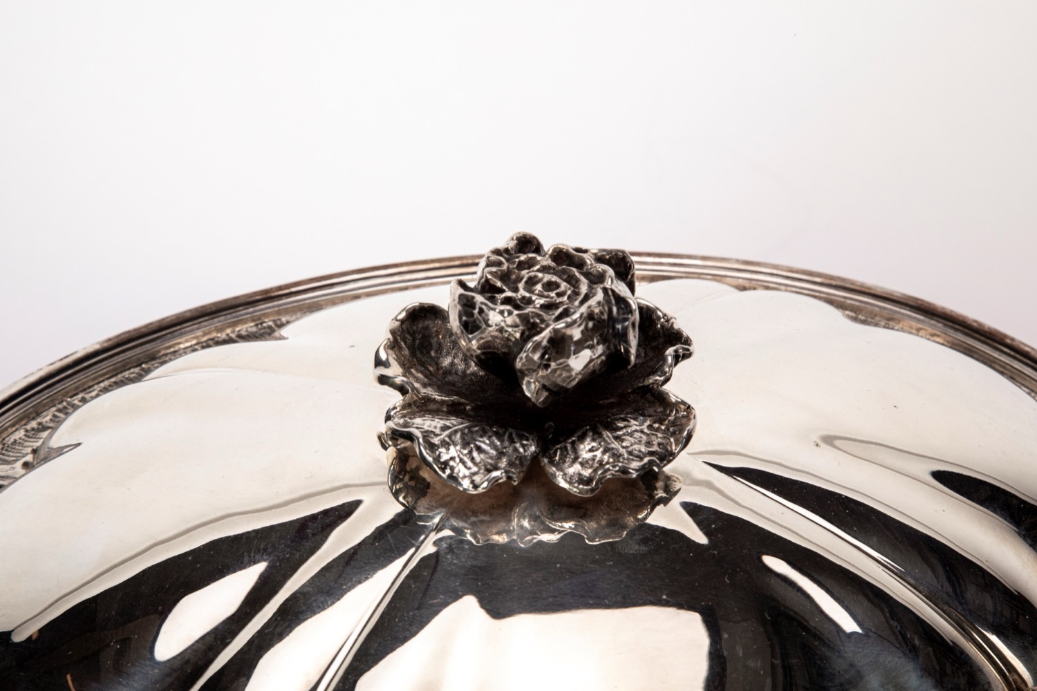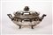corpo bombato di forma ovoidale decorato con incisioni sulla fascia prese cesellate e pomolo del coperchio a fiore a tutto tondo, piedini a ricciolo.
