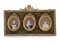 Tre miniature su avorio entro cornici applicate su pannello con cornice in metallo dorato, cm 9,5x8, dim. totali 23,5x40.