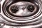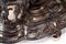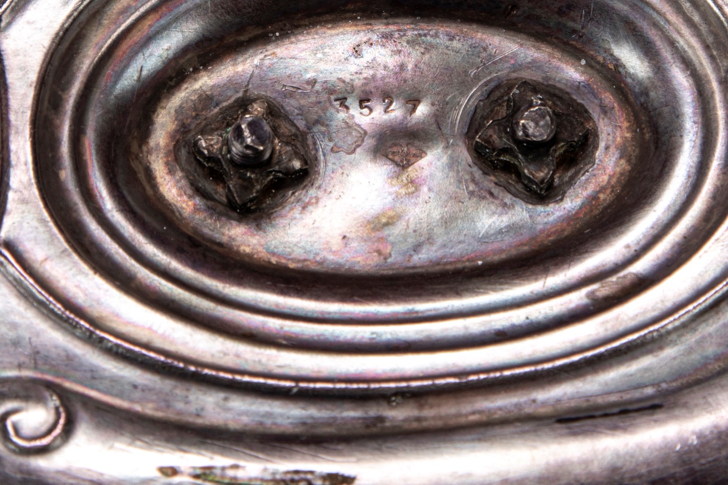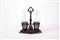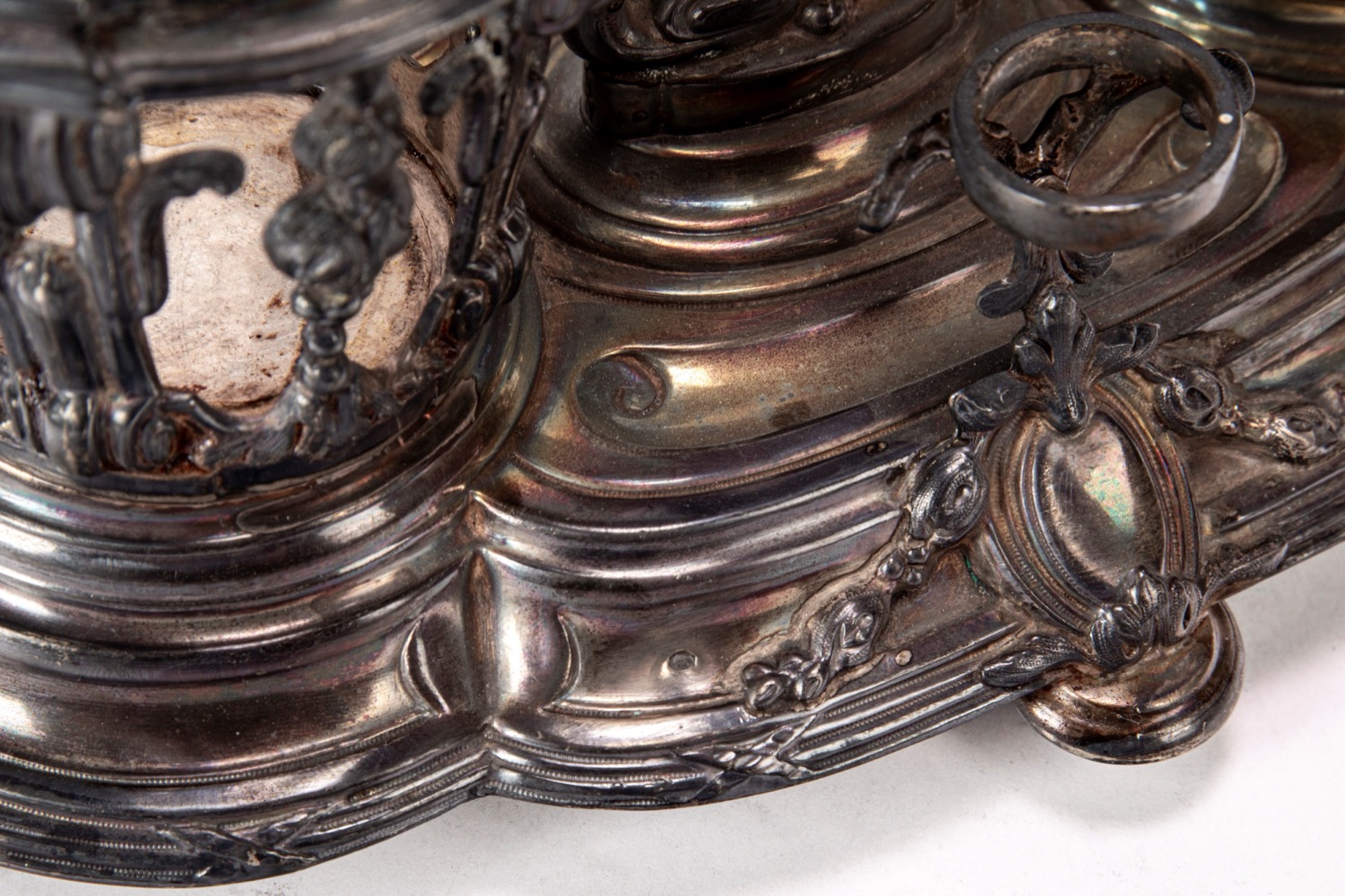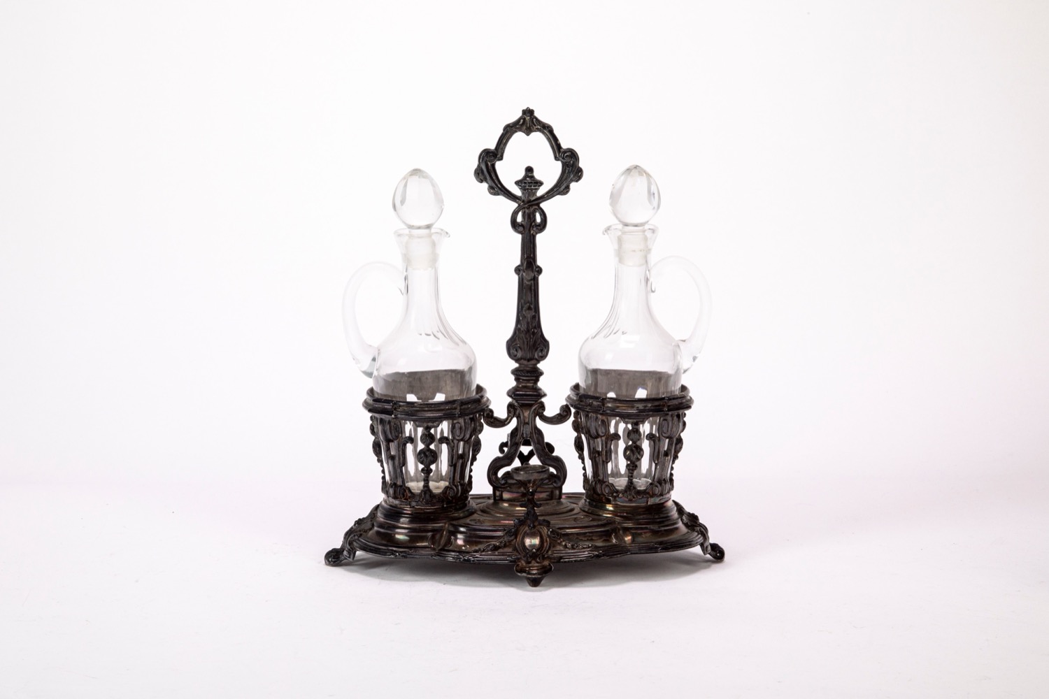 con base porta ampolle sagomata e sbalazata a nastri e volute con presa centrale sbalzata a foglie, base con piedini mossi ,(boccette in vetro non coeve). (Lievi difetti).