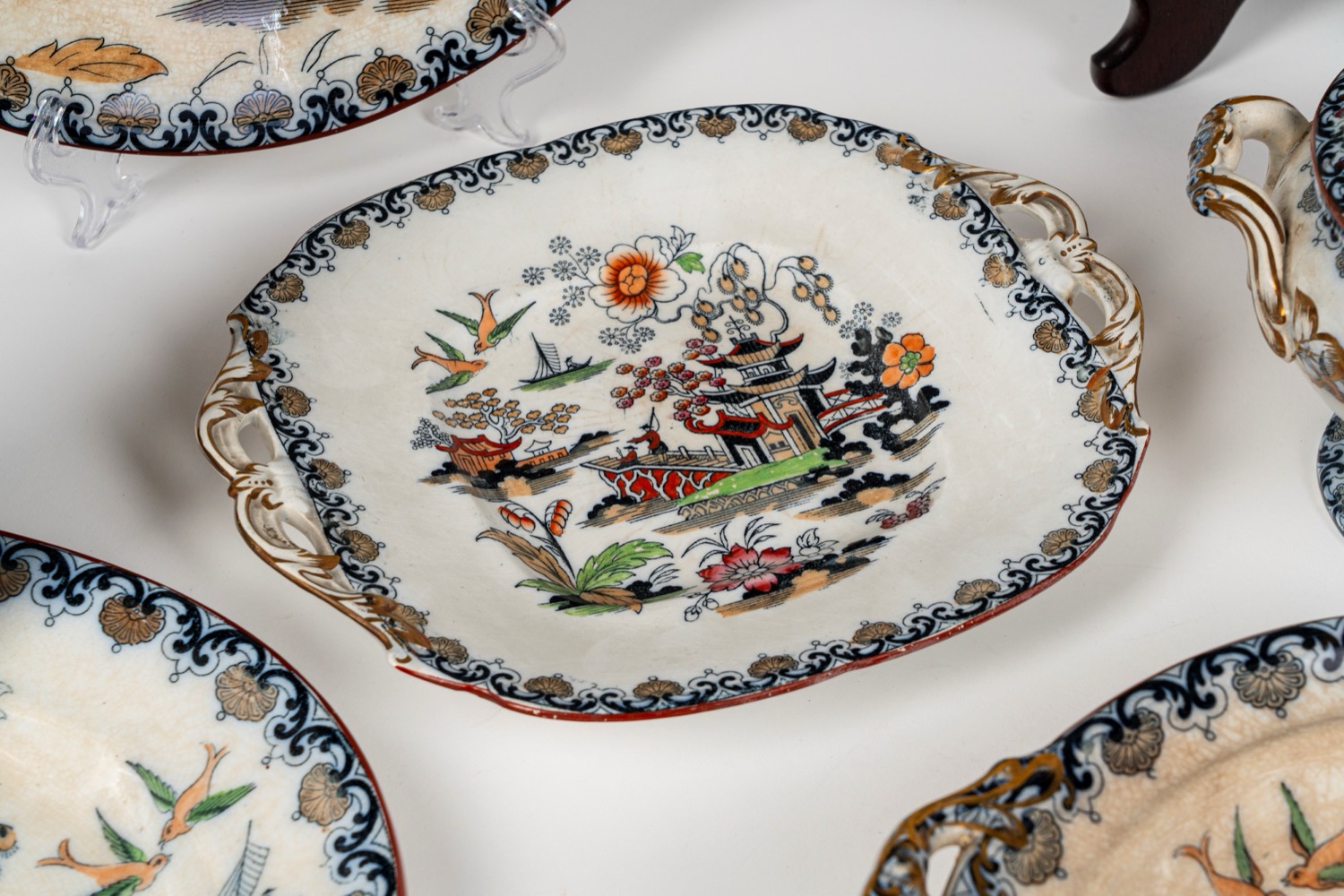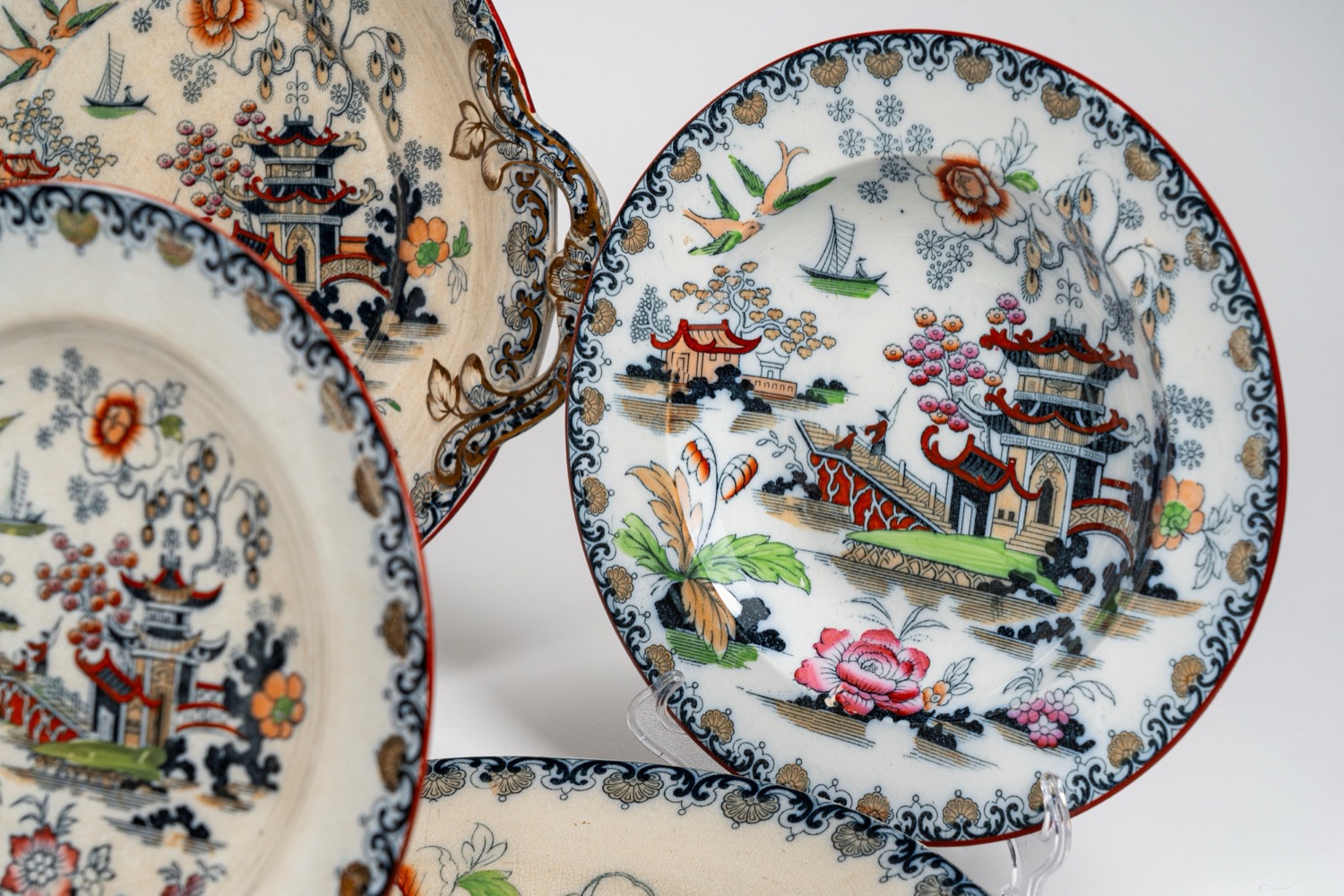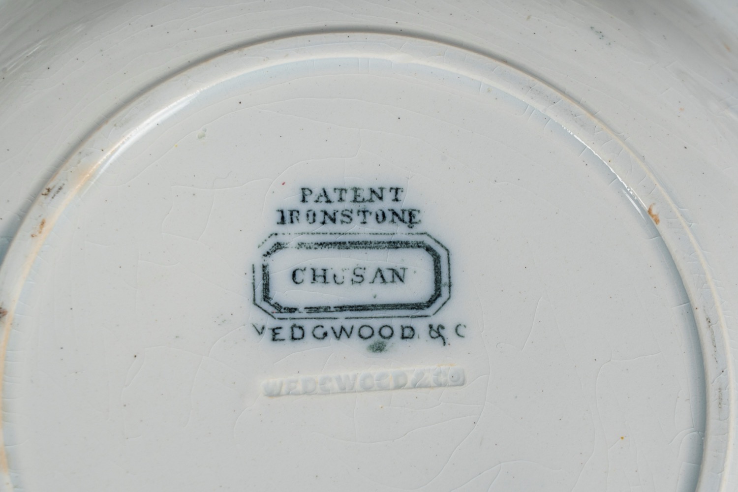 Manifattura Wedgwood, 1900 circa. Servizio di piatti in ceramica a decoro "chusan" policromo a paesaggi di gusto orientale, rami fioriti, uccelli e bordo con ghirlanda decorativa