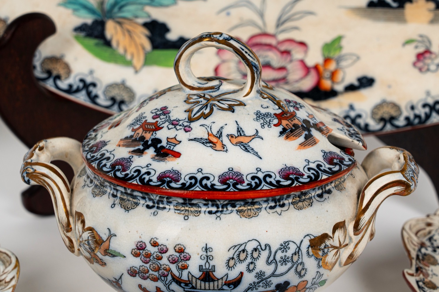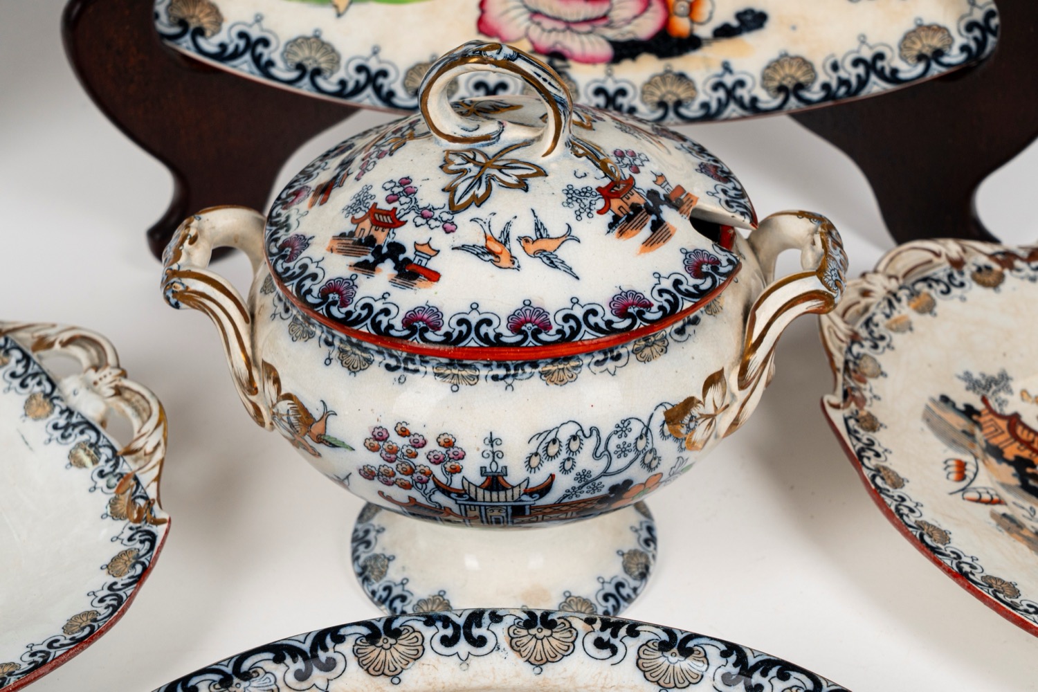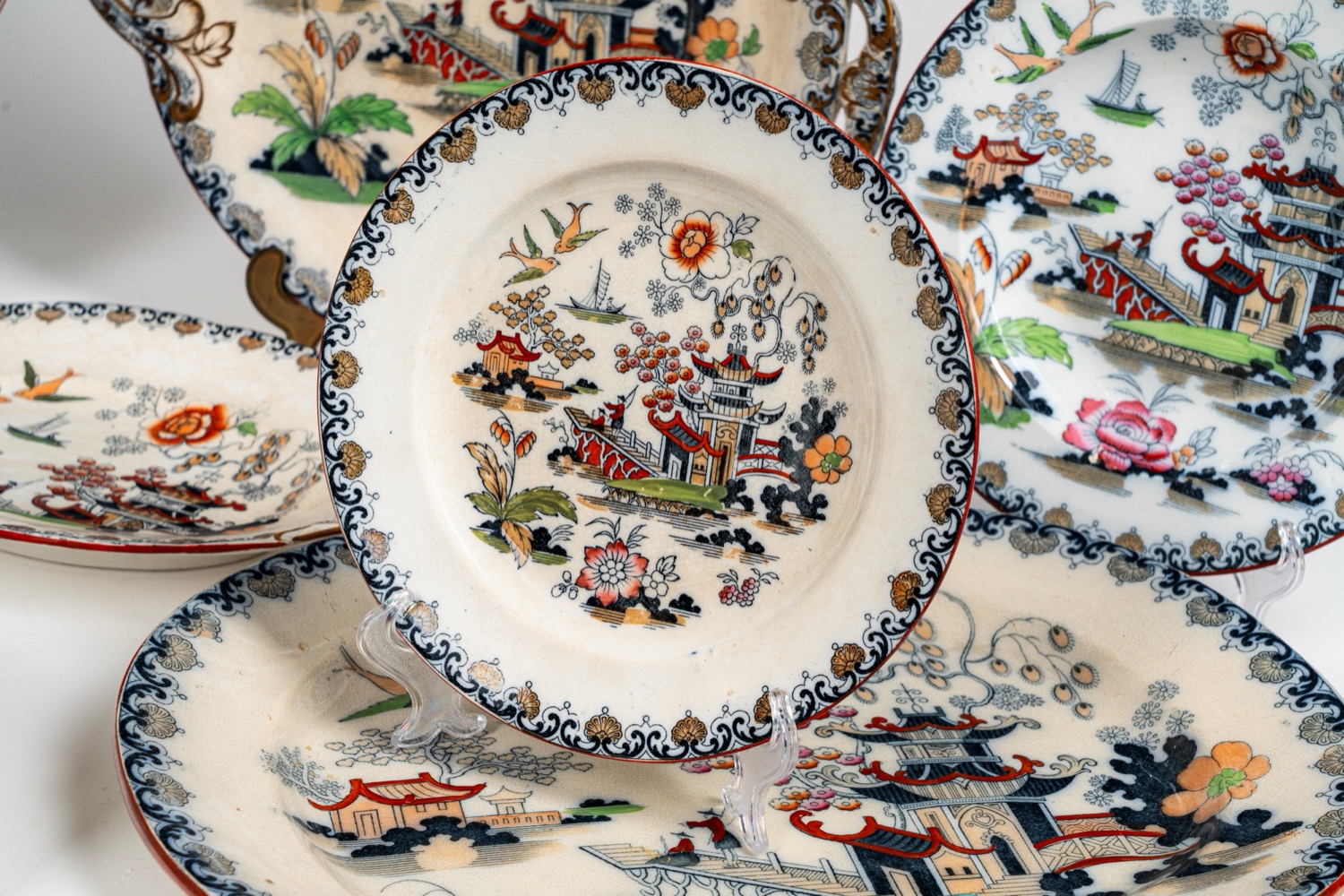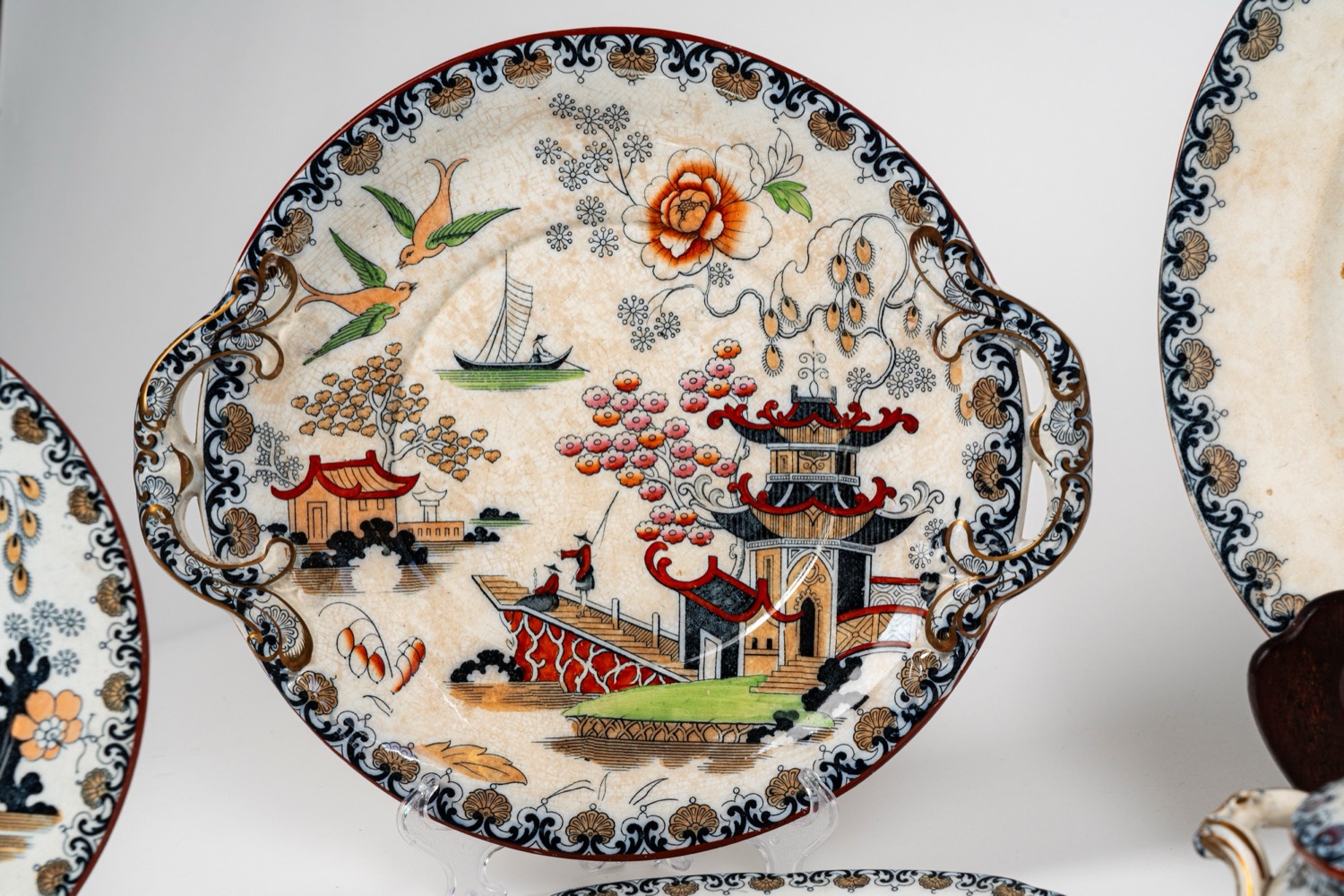 Manifattura Wedgwood, 1900 circa. Servizio di piatti in ceramica a decoro "chusan" policromo a paesaggi di gusto orientale, rami fioriti, uccelli e bordo con ghirlanda decorativa
