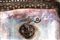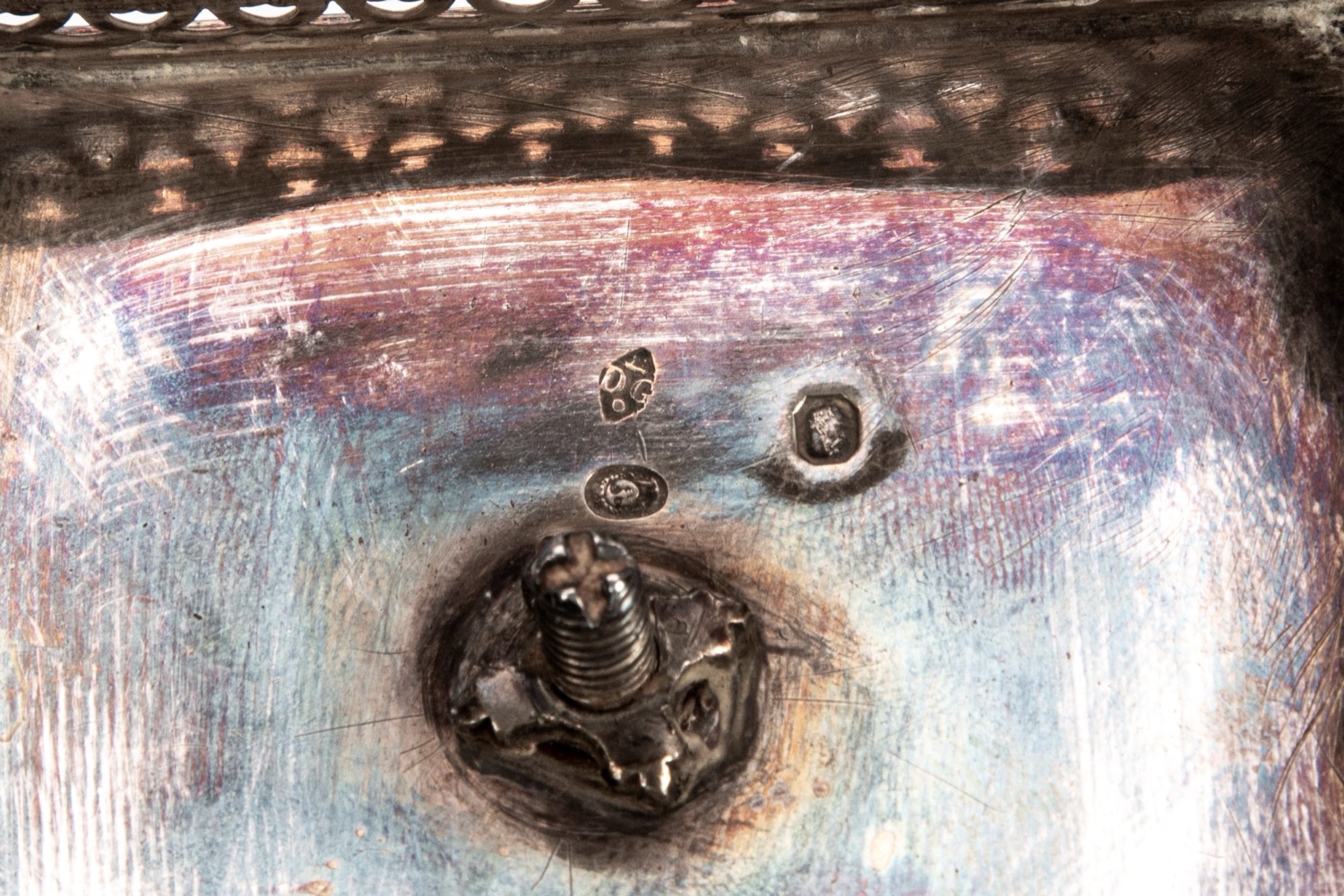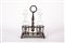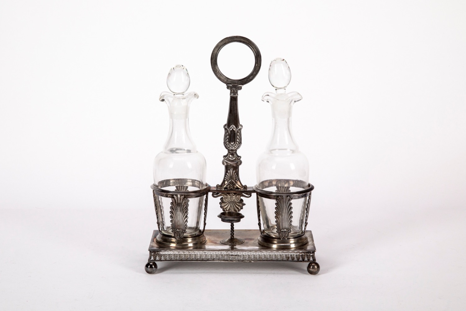di gusto Impero, presa centrale con anello, decoro a volute e conchiglie stilizzate; vani porta bottiglie con palmette sbalzate, base rettangolare con decoro traforato e piedini sferici, boccette in vetro di epoca posteriore.