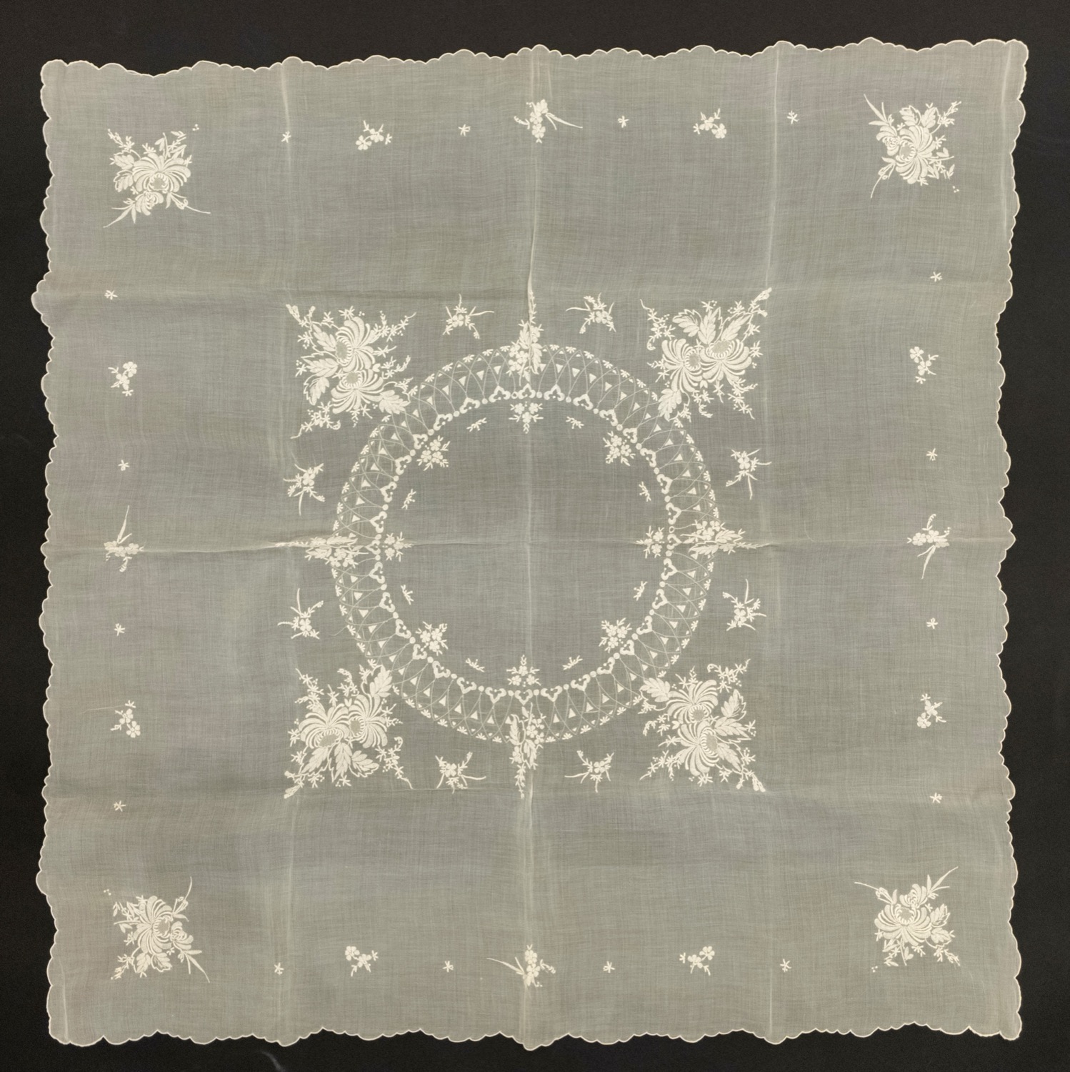 Tovaglia a bordo mosso con medaglione centrale ovale contornato da bouquet di fiori