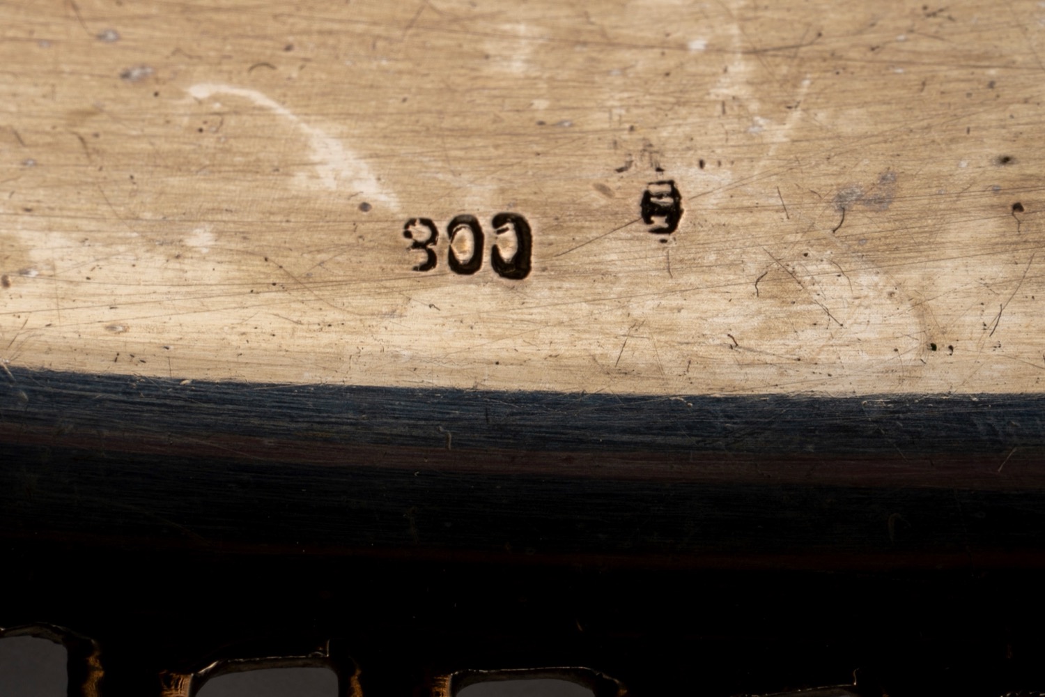 a corpo ovale con bordo traforato a motivi vegetali stilizzati.