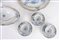 12 piatti piani (diametro cm 28), 12 piatti fondi (diametro cm 22), 12 piatti da frutta (diametro cm 22,5), 12 tazzine da caffè con piattino (altezza tazzina cm 5 e diametro piattino cm 11), una salsiera, un piatto da portata tondo, un piatto da portata ovale, un'insalatiera e una zuppiera con coperchio