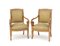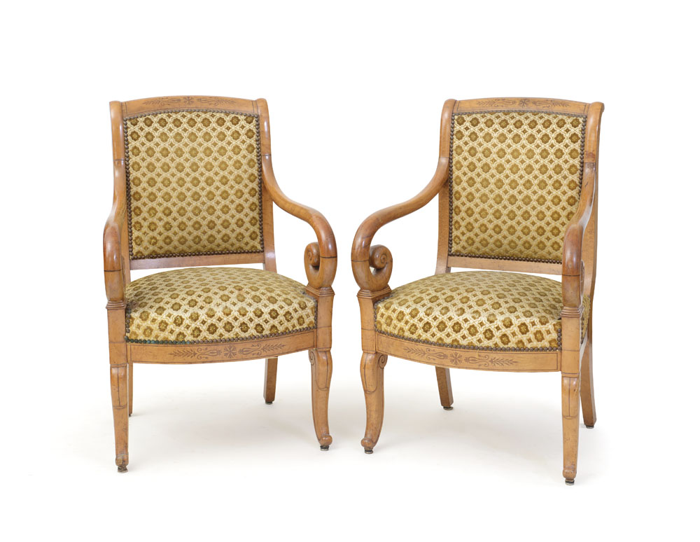 COPPIA DI POLTRONE CARLO X, PRIMA META' XIX SECOLO, in legno chiaro, braccioli a pastorale, decori ad intarsio; usure.