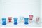 Lotto di tre bicchieri rosa e tre bicchieri azzurri in vetro e un coppa in ceramica bianca e blu di manifattura Royal Crown Derby, Inghilterra.