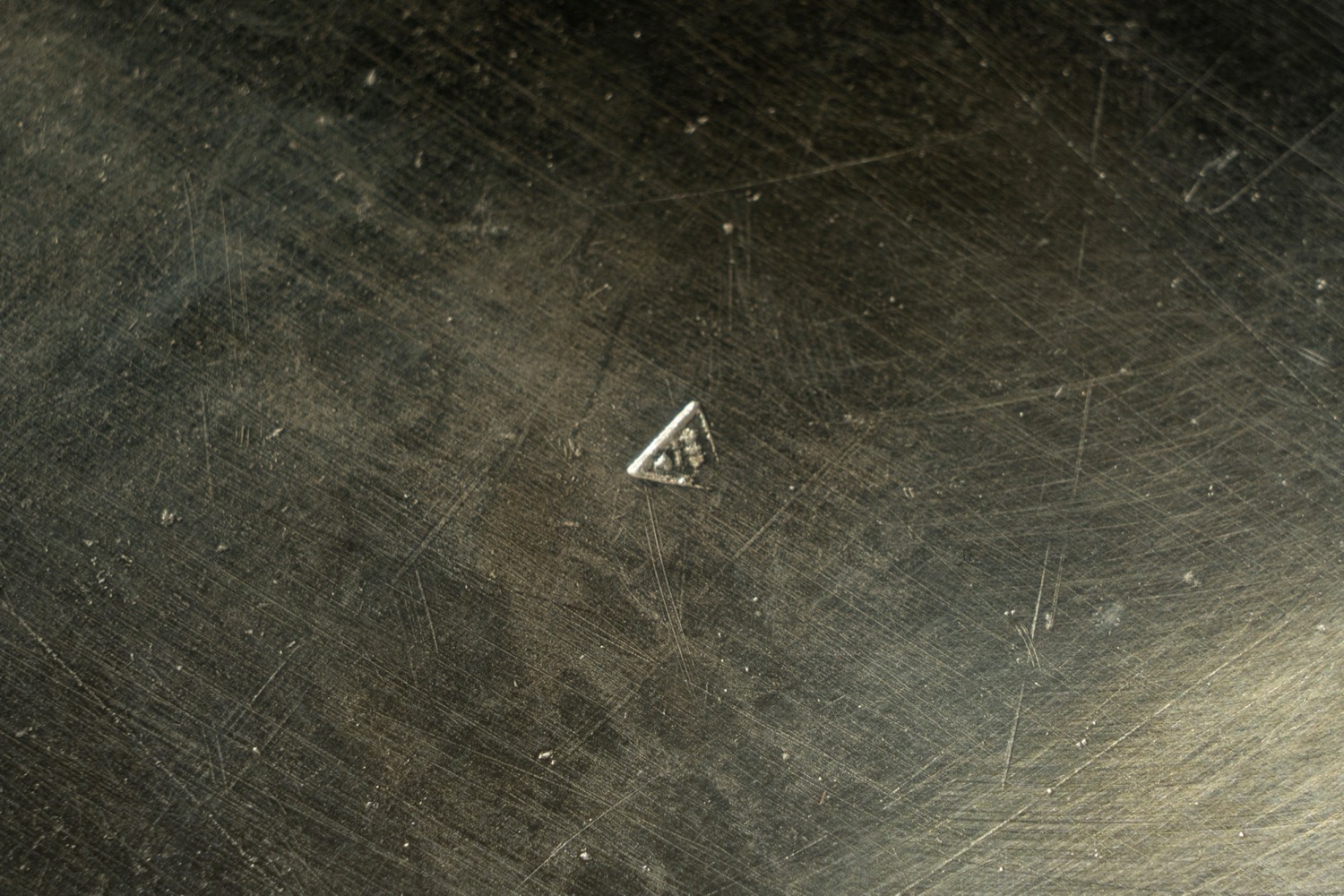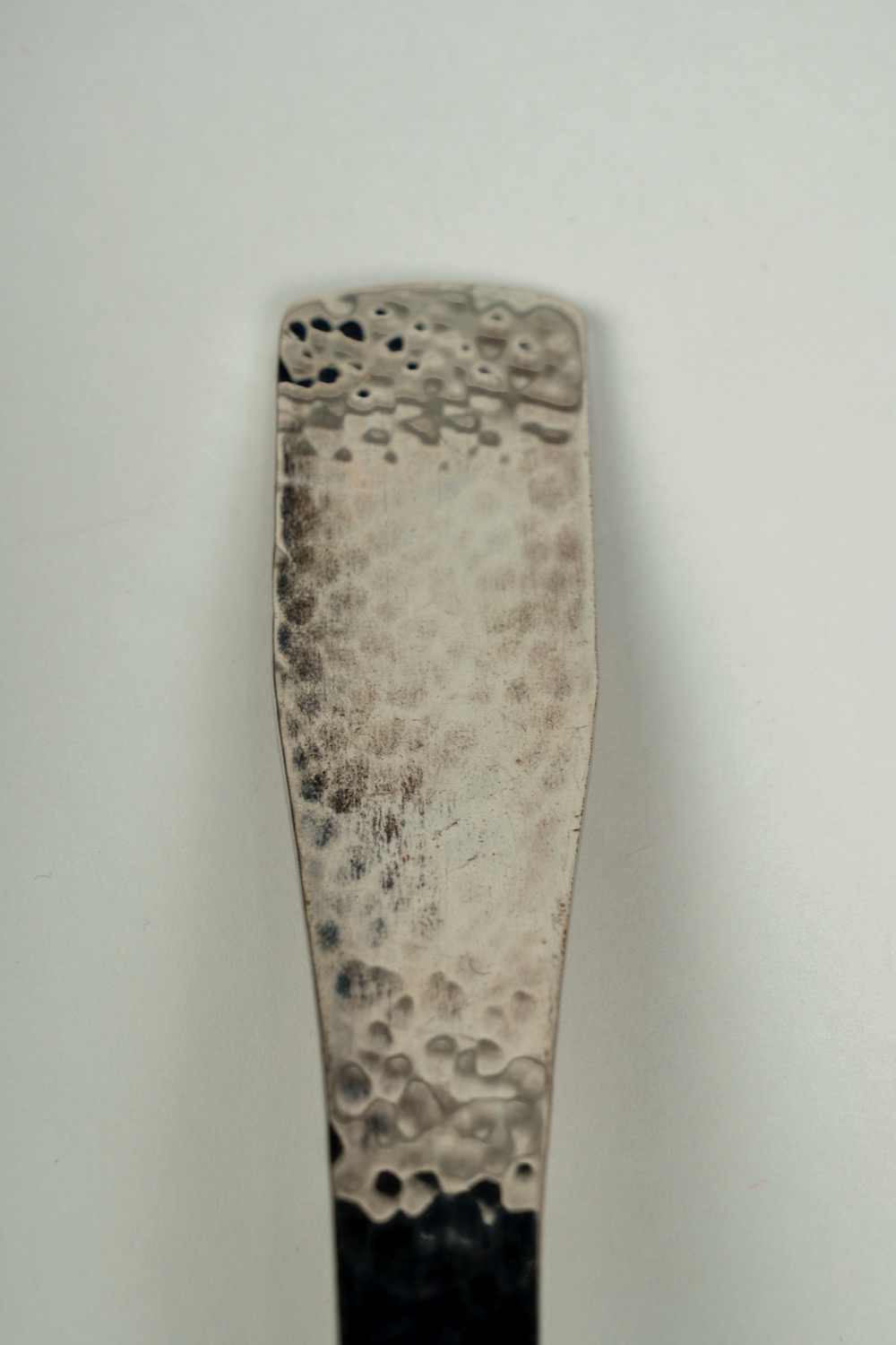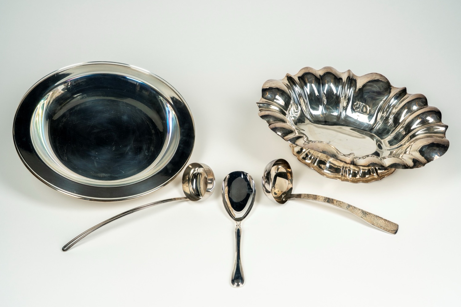 Lotto composto da un'alzata di forma mossa e costolata, un piatto da portata e tre posate a servire in metallo argentato
