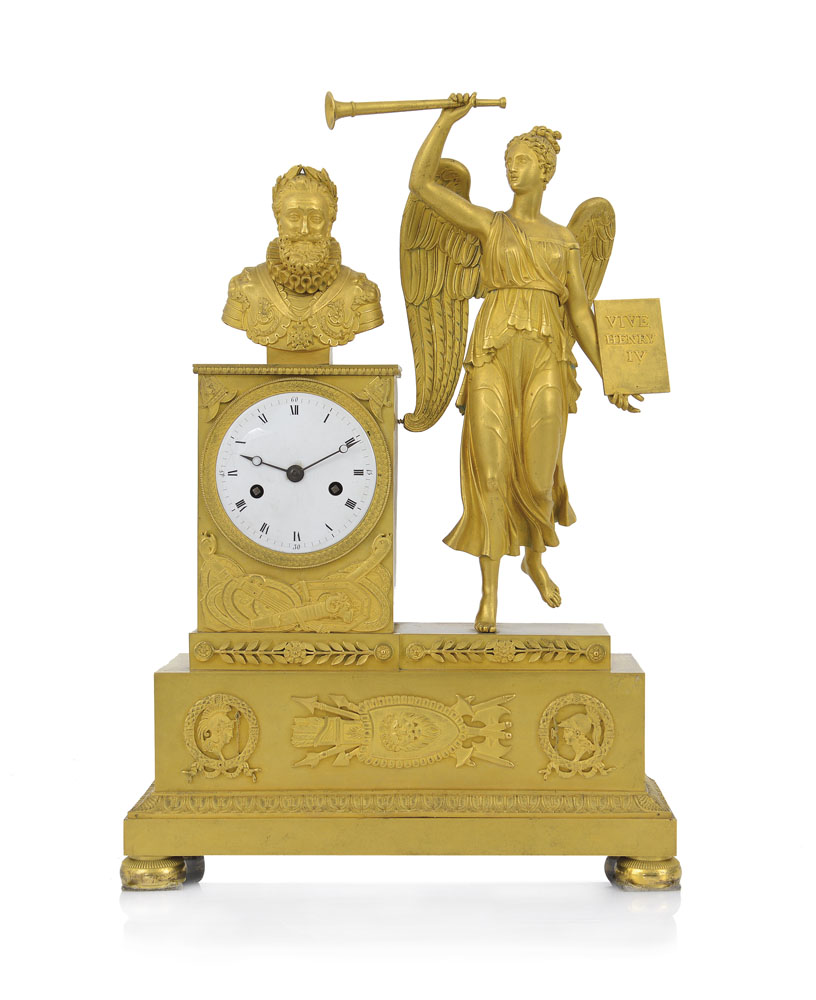 PENDOLA DA TAVOLO IMPERO IN BRONZO DORATO, INIZIO XIX SECOLO, cassa a plinto con fascia a bassorilievo cimata da busto di Enrico IV e Vittoria alata,quadrante con disco smaltato e numeri romani; suoneria delle ore e delle mezze; mancante di pendolo e chiave e da revisionare.
