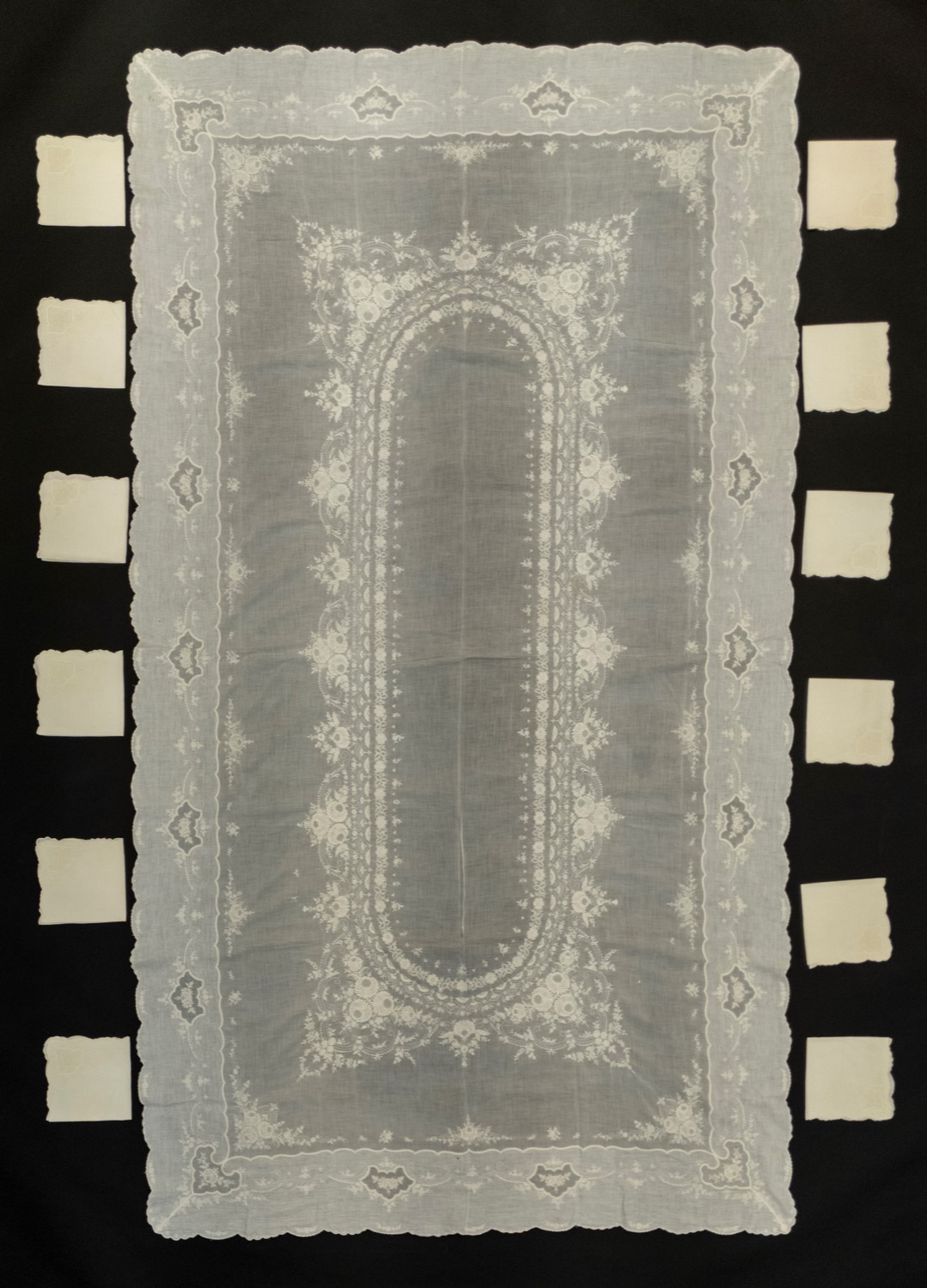 Tovaglia rettangolare in cotone con medaglione centrale di forma ovale decorata a fiori e rose, bordura mossa con riserve a fiori con 12 tovaglioli