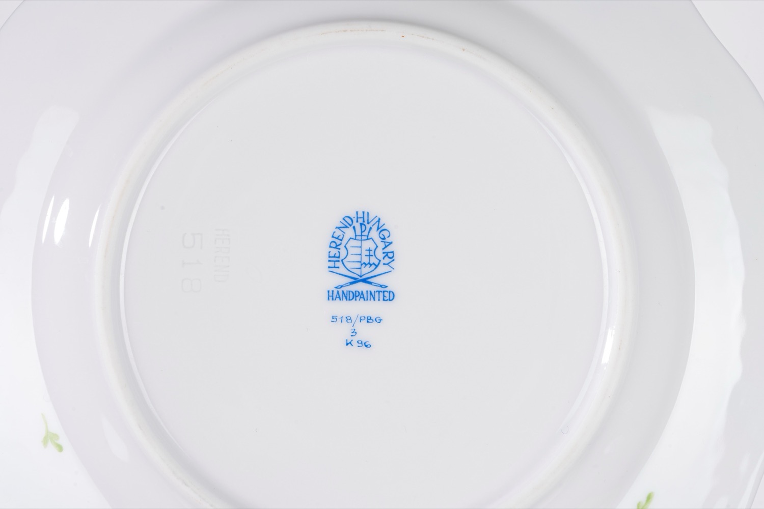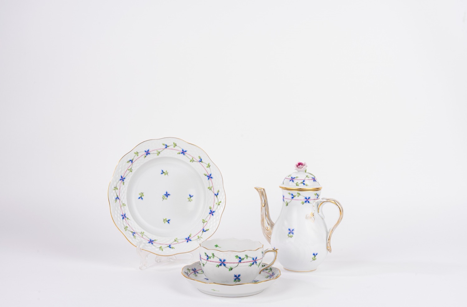 Lotto composto da teiera, tazza con piattino e piatto da dolce, in porcellana decorata in policromia, Herend