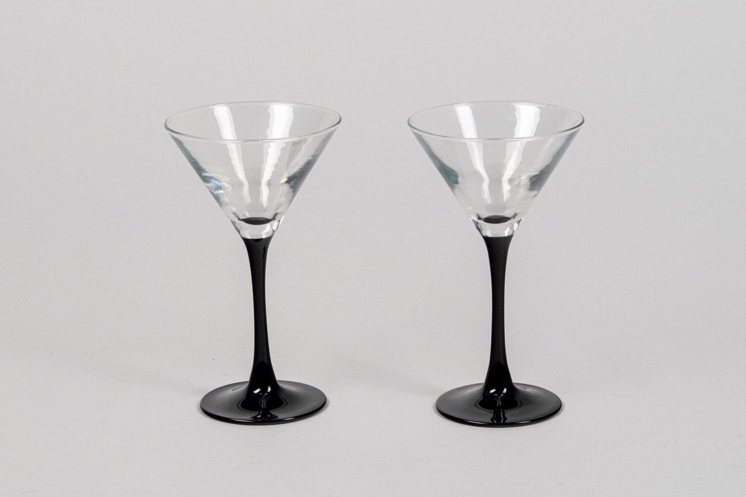 Coppia di calici da cocktail in vetro di Murano incolore con stelo e base color nero, secolo XX
