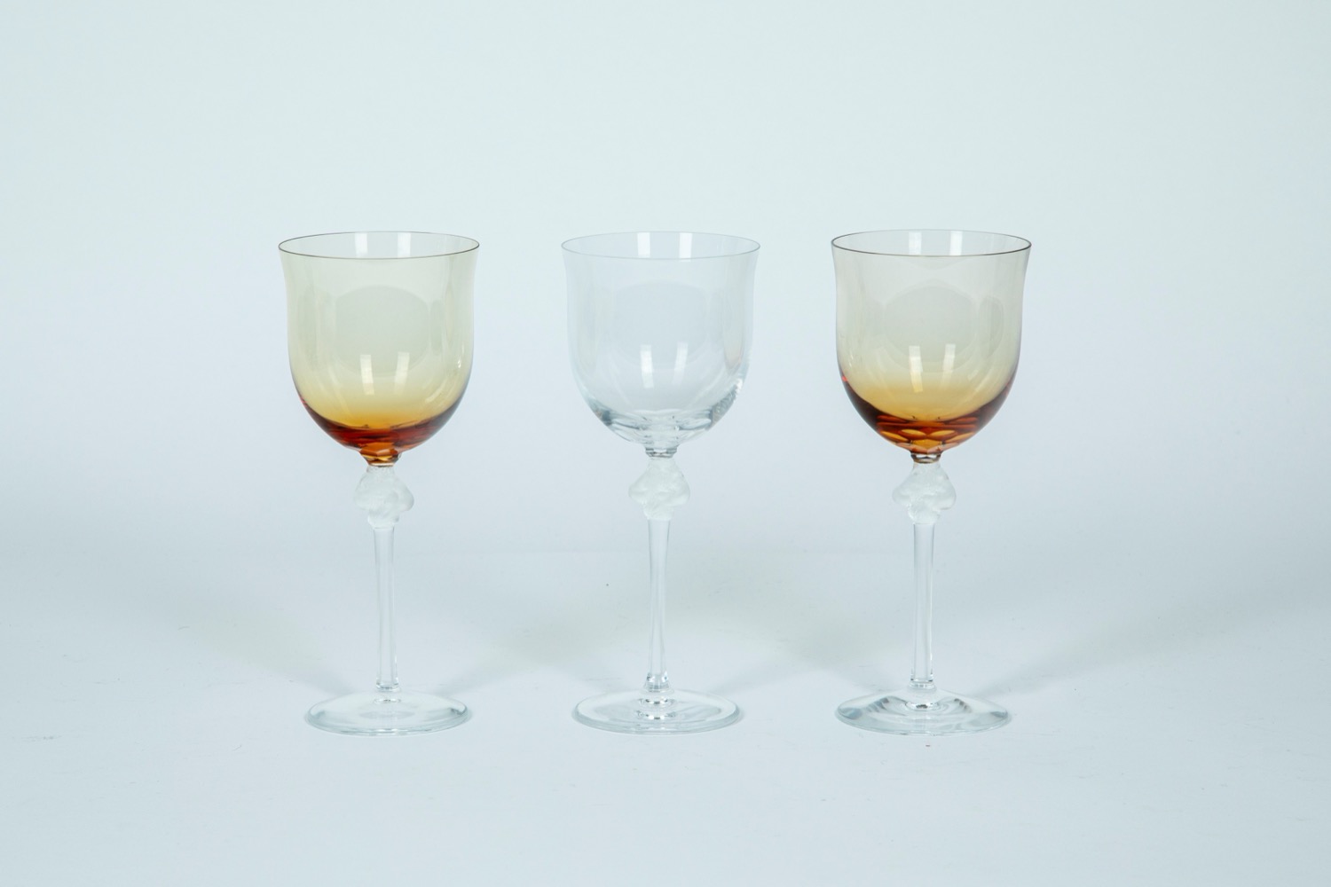 Lalique France. Tre calici in cristallo trasparente e ambra