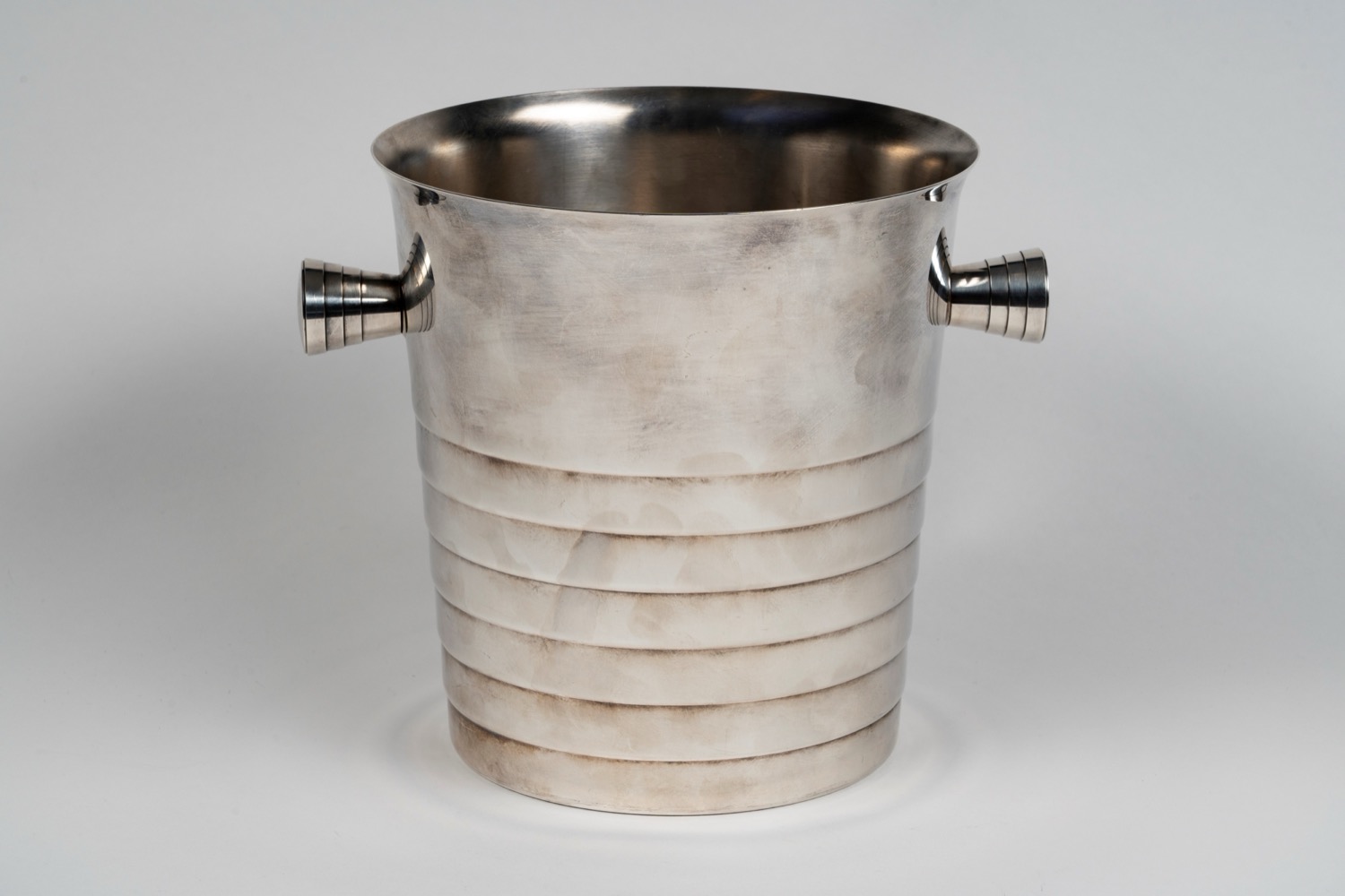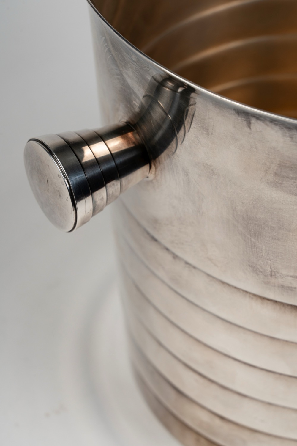 Christofle, metà secolo XX, Secchiello porta ghiaccio in argento a corpo liscio decorato a torniture alernate geometriche.