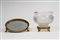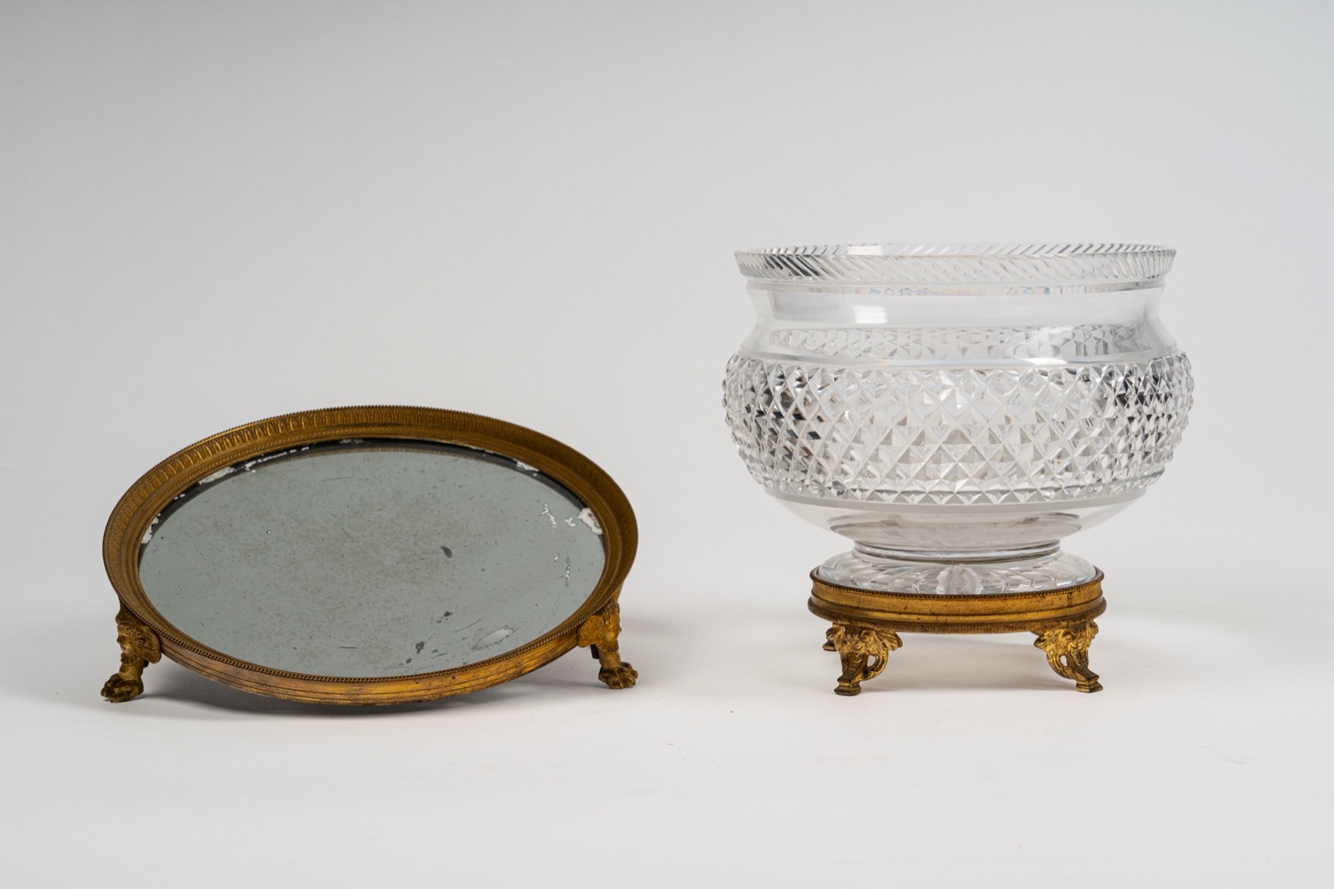 Centrotavola con parte superiore semisferica in cristallo molato poggiante su base di gusto “Impero” in bronzo cesellato unito ad un centrotavola di gusto “impero” di forma circolare con fondo a specchio e supporto in bronzo dorato con piedini cesellati fine secolo XIX - Inizio secolo XX