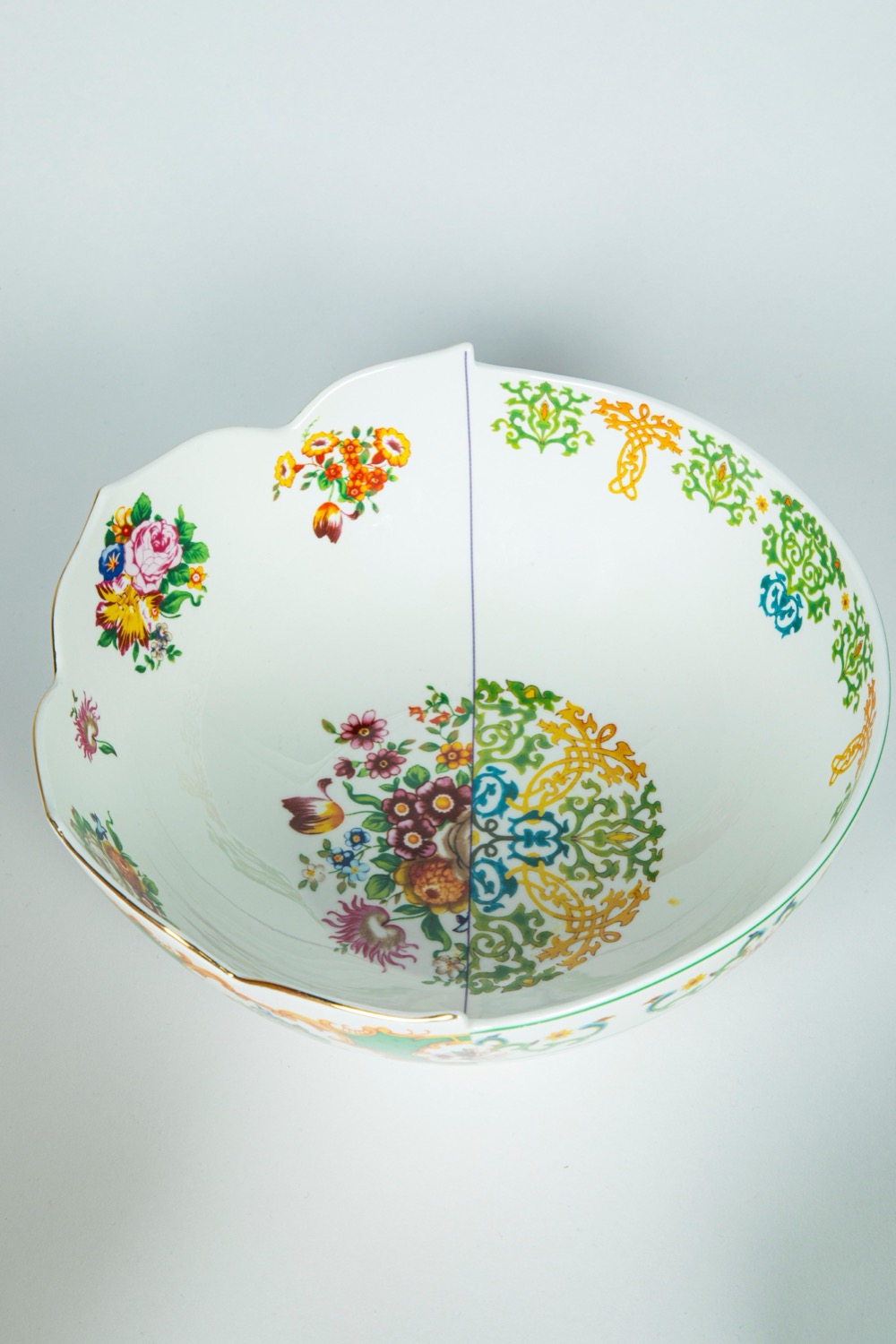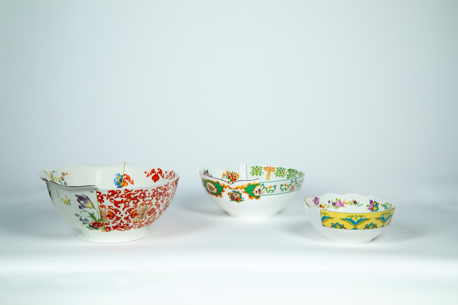 CTRLZAK Art & Design Studio × Seletti — Hybrid desig. Tre ciotole di misure differenti in porcellana bianca decorata in policromia e con dorature a motivo asiatico europeo con decori floreali. New Born China.