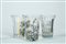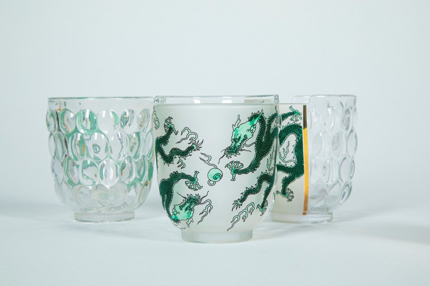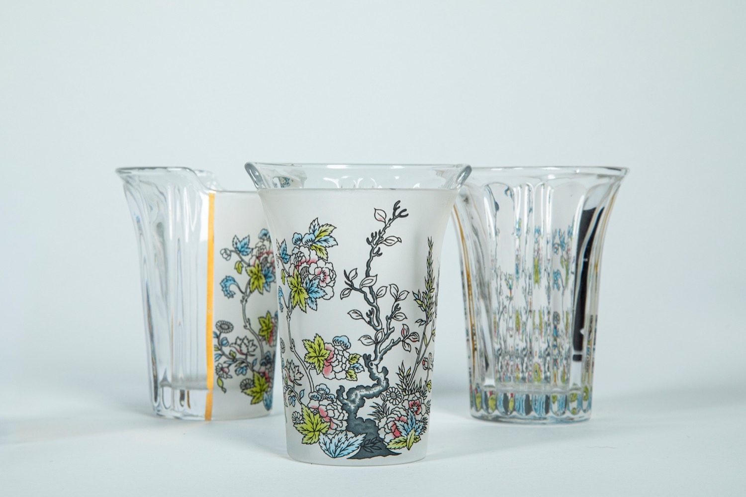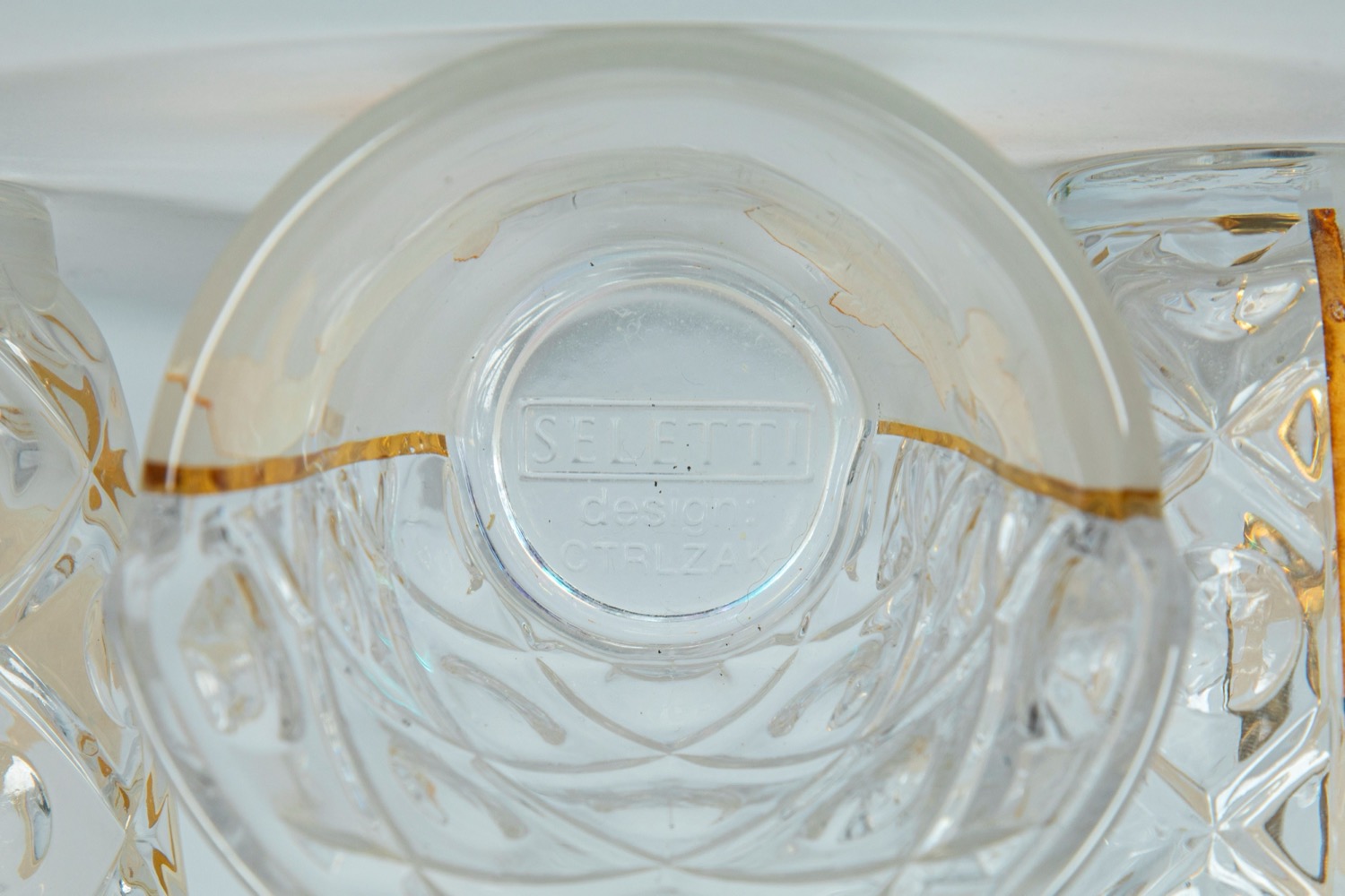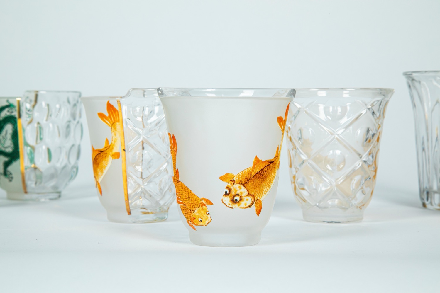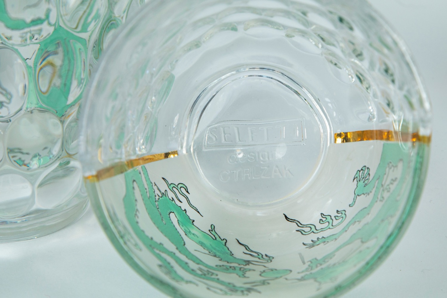 CTRLZAK Art & Design Studio × Seletti — Hybrid Agluara. Nove bicchieri da cocktail in vetro trasparente con decori policromi e dorati a motivo orientali occidentali.