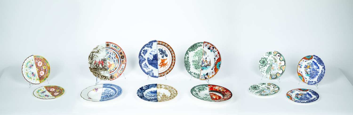CTRLZAK Art & Design Studio × Seletti — Hybrid design. Set composto da 3 fondine, 3 piatti fondi, 6 piattini da frutta o insalata in porcellana bianca decorata in policromia e con dorature a motivo asiatico europeo. New Bone China.