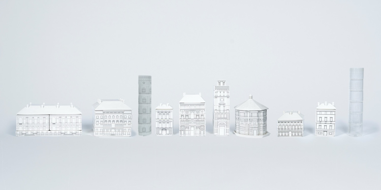 il set rappresenta una piazza rinascimentale italiana ideale progettato in modo che i tetti siano coperchi e i piani siano piatti o ciotole. Il set è di 10 edifici: palazzo ducale (composto da due ciotoli e due vassoi), palazzo del governo (composto da sei piatti fondi e una zuppiera), palazzo della signoria (composto da sei piatti piani e una zuppiera), torrione (composto da sei ciotole), due torri cordinate di bicchieri in vetro una nera (un bicchiere con una piccola inclinatura interna non percepibile) e l'altra chiara, una palazzina minore (composta da 6 piatti da antipasto), due palazzine minori (entrambi composti da due contenitori da cucina con chiusura ermetica), e un battistero (composto da una biscottiera, sei tazze e una lattiera).il set rappresenta una piazza rinascimentale italiana ideale progettato in modo che i tetti siano coperchi e i piani siano piatti o ciotole. Il set è di 10 edifici: palazzo ducale (composto da due ciotoli e due vassoi), palazzo del governo (composto da sei piatti fondi e una zuppiera), palazzo della signoria (composto da sei piatti piani e una zuppiera), torrione (composto da sei ciotole), due torri cordinate di bicchieri in vetro una nera (un bicchiere con una piccola inclinatura interna non percepibile) e l'altra chiara, una palazzina minore (composta da 6 piatti da antipasto), due palazzine minori (entrambi composti da due contenitori da cucina con chiusura ermetica), e un battistero (composto da una biscottiera, sei tazze e una lattiera).