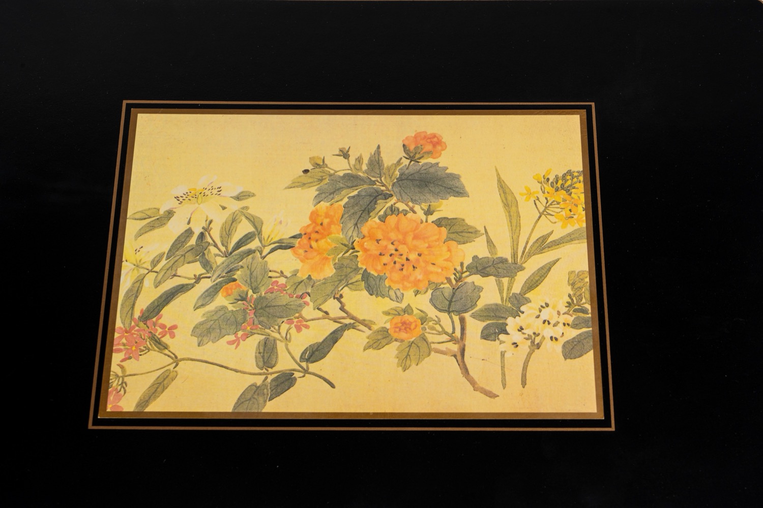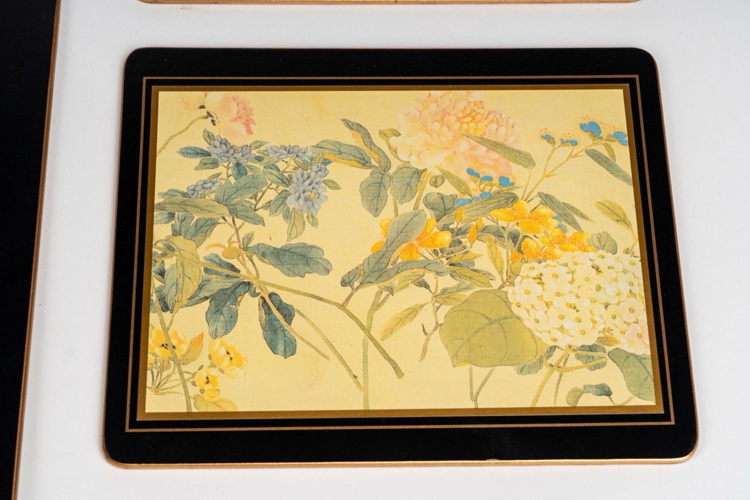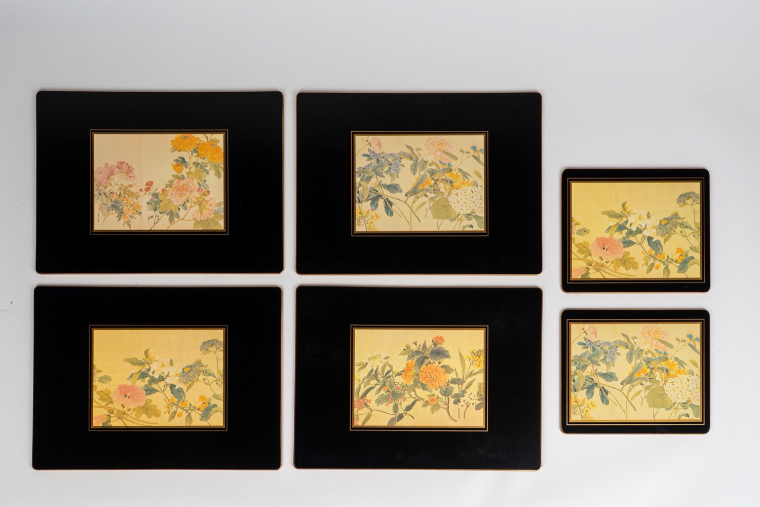 composto da 4 tovagliette all'americana e 2 sottopiatti con decorazione floreale policroma su fondo avorio entro conrice nera con filetto dorato. composto da 4 tovagliette all'americana e 2 sottopiatti con decorazione floreale policroma su fondo avorio entro conrice nera con filetto dorato.