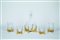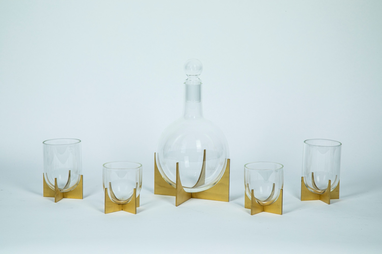 Decanter e quattro bicchieri in vetro soffiato incolore su supporto in ottone