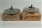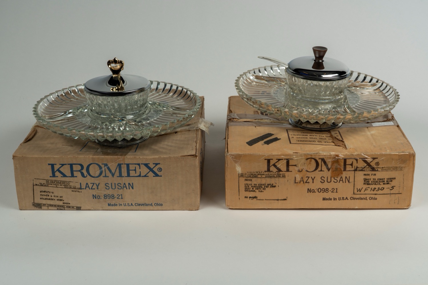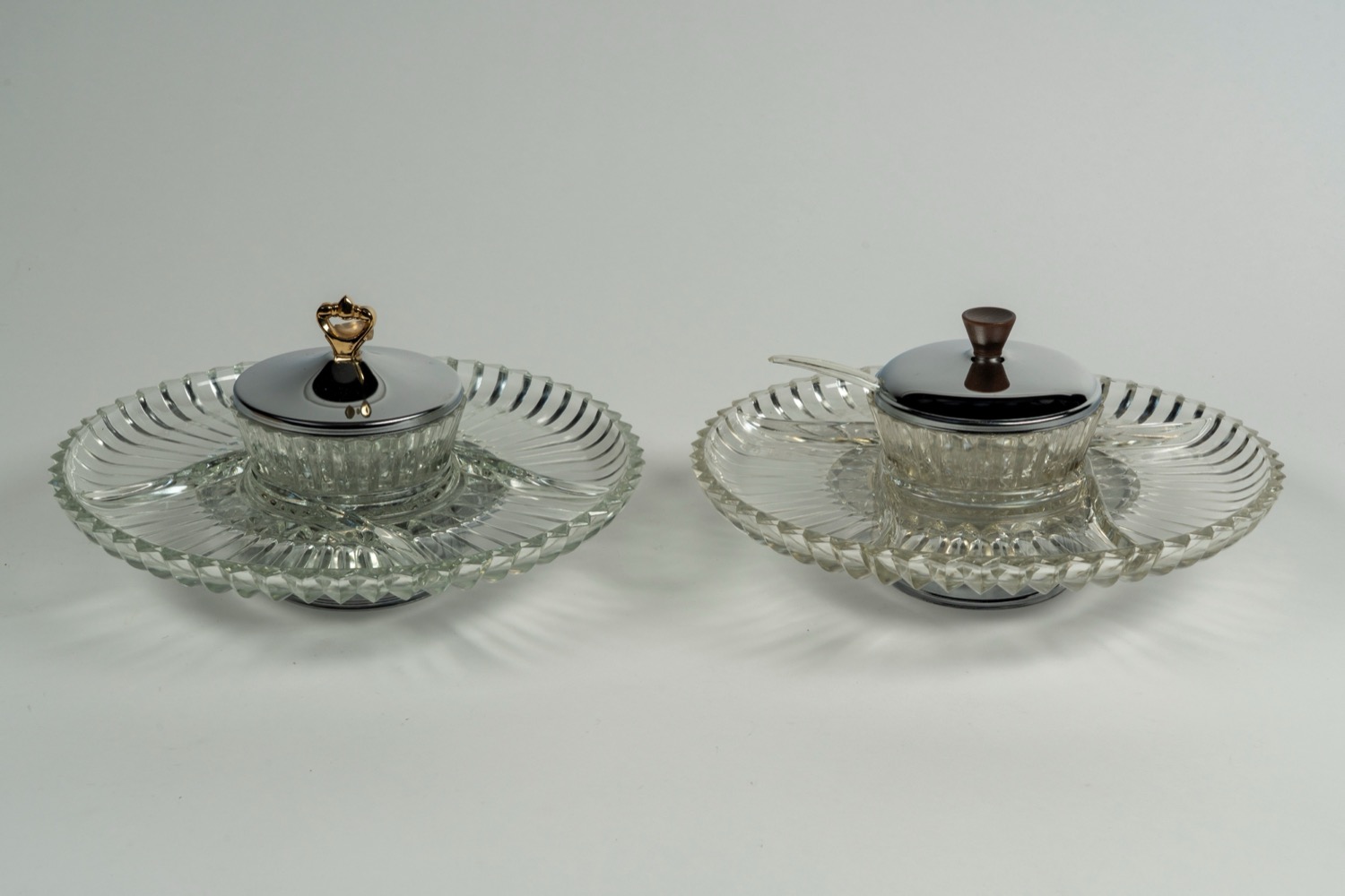 Kromex Lazy Susan coppia di vassoi girevoli in metallo cromato e vetro per antipasti, American manufacturing, 1960s