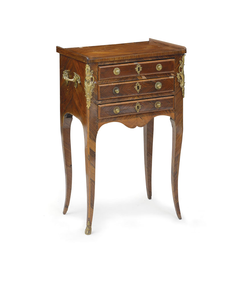 MOBILETTO LUIGI XVI INTARSIATO, XVIII SECOLO, a tre cassetti con gambe mosse a bronzi dorati applicati; restauri, mancanze e sbeccature.