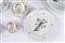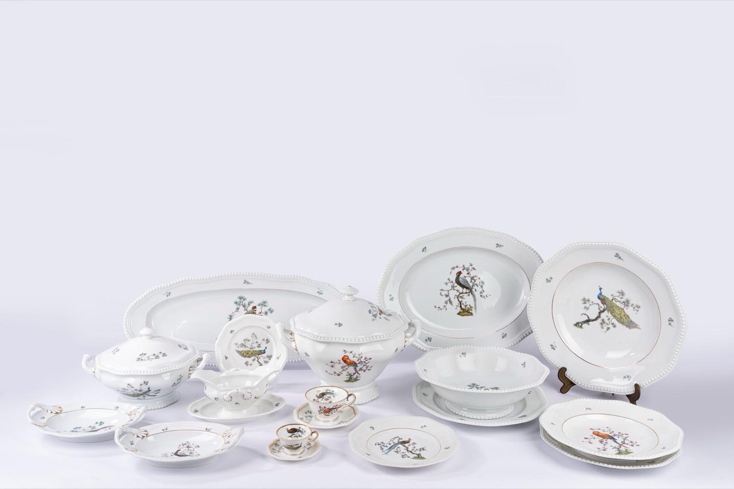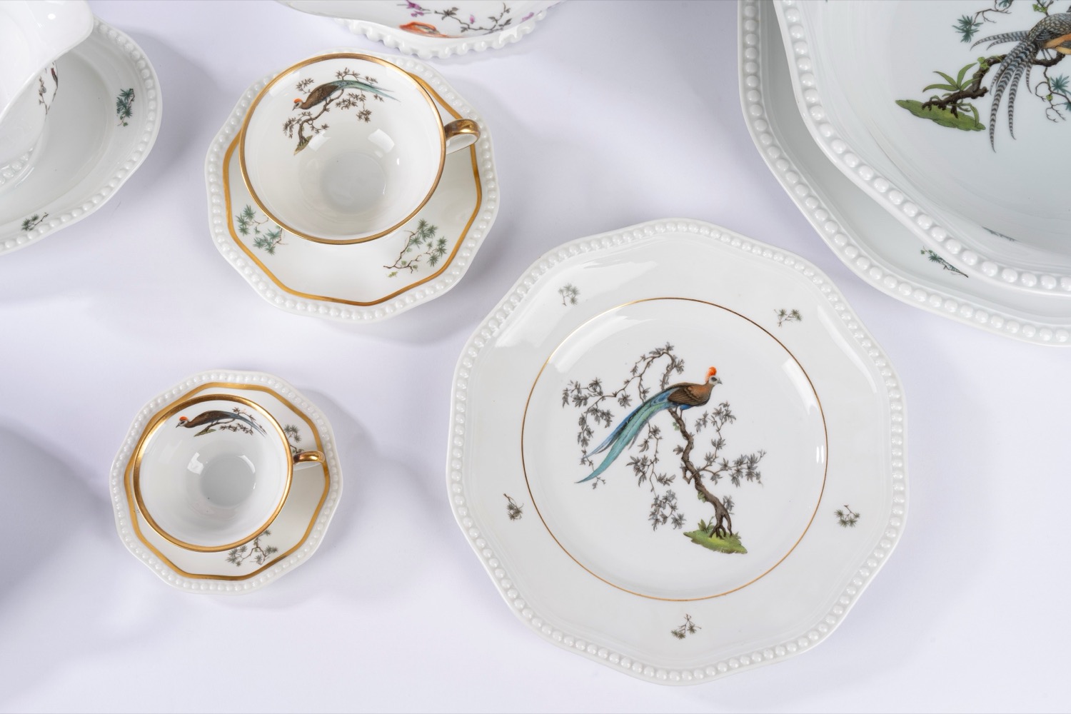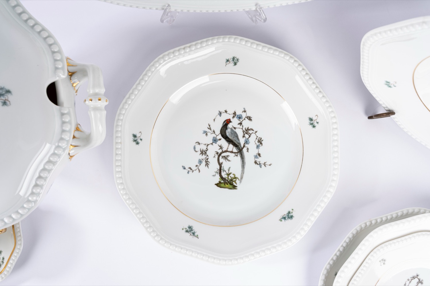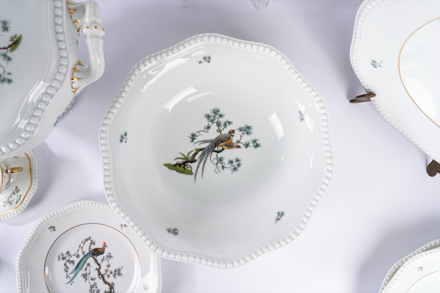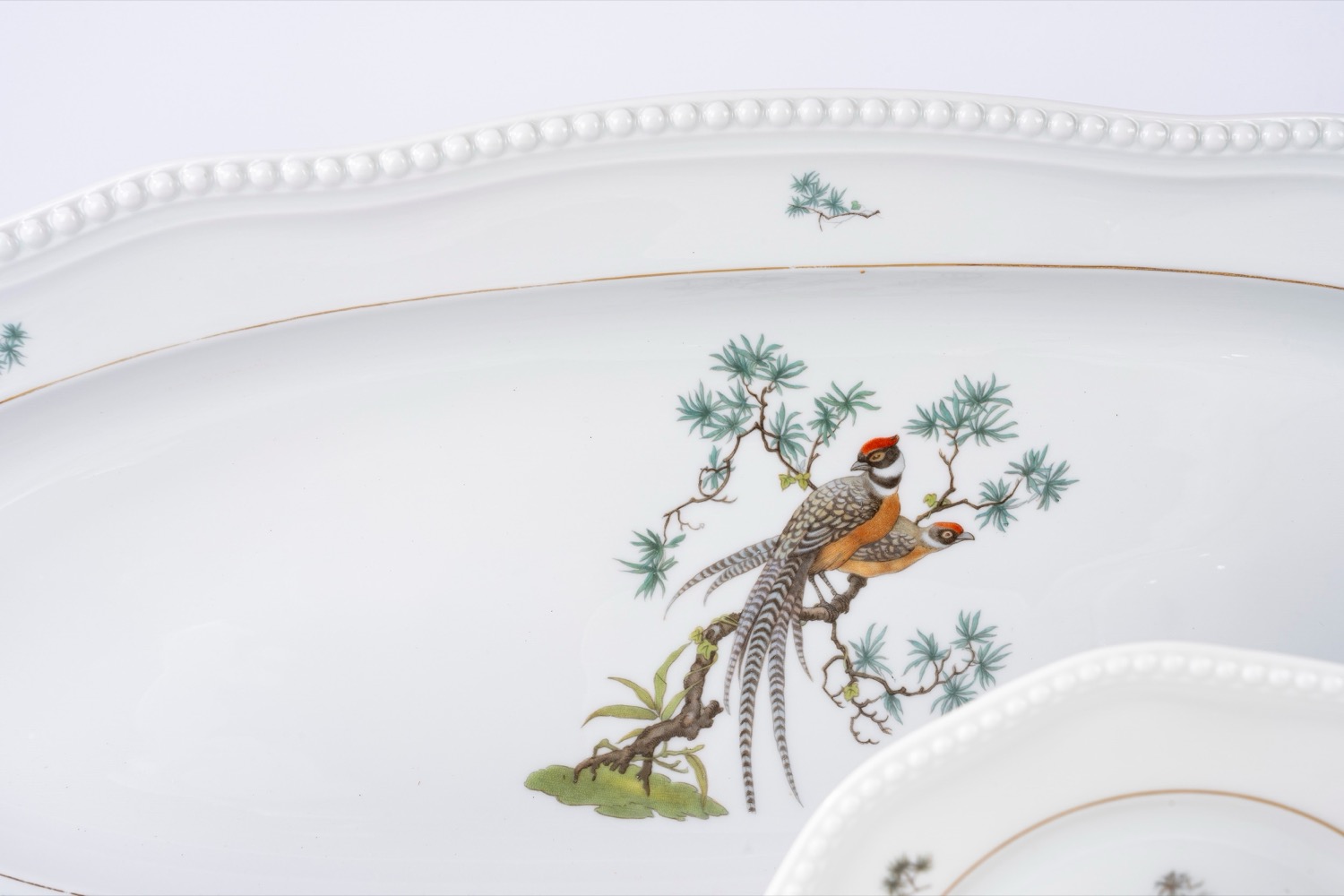 Porcellana bianca a bordo mosso con profilo a rilievo perlinato, decorata in policromia a uccelli su rami fioriti.