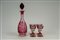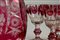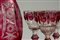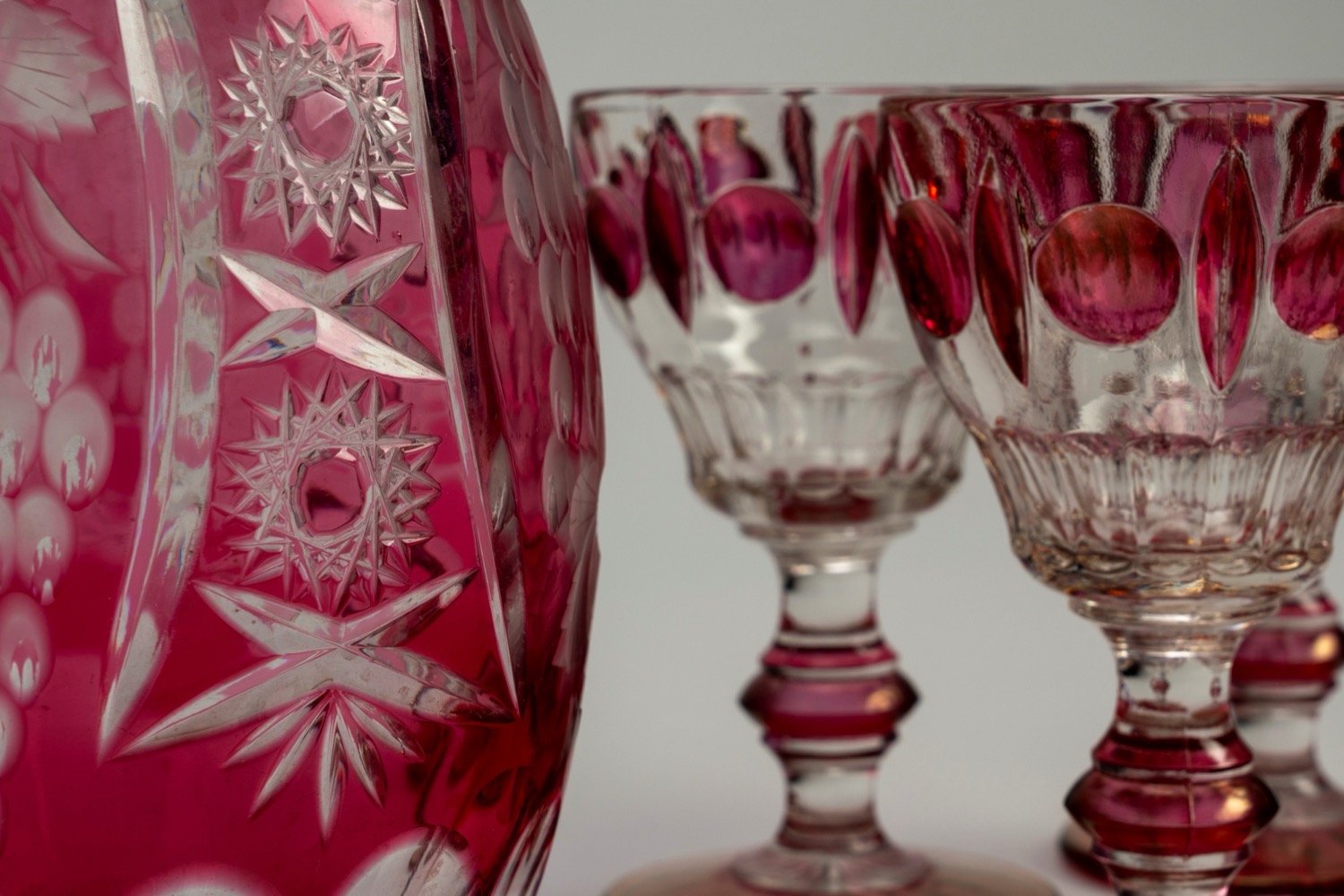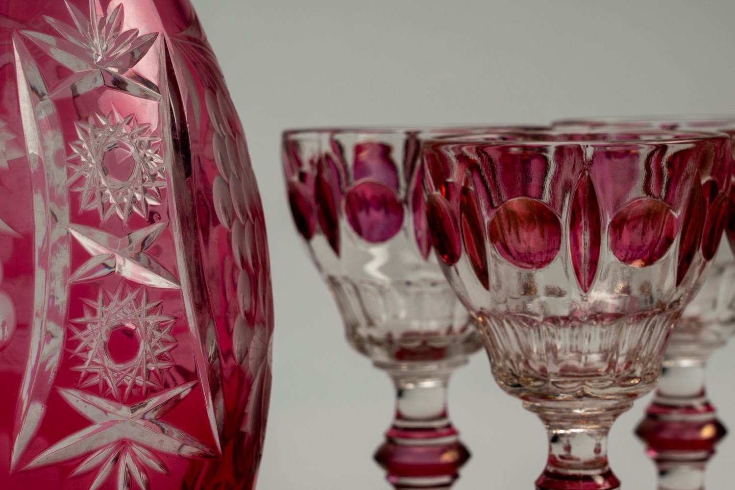 Lotto composto da una brocca in vetro color rubino inciso a tralci d'uva e motivi a stella e quattro piccoli calici in vetro trasparente e color rubino con coppa a motivi geometrici e stelo a balaustro su piede circolare.
