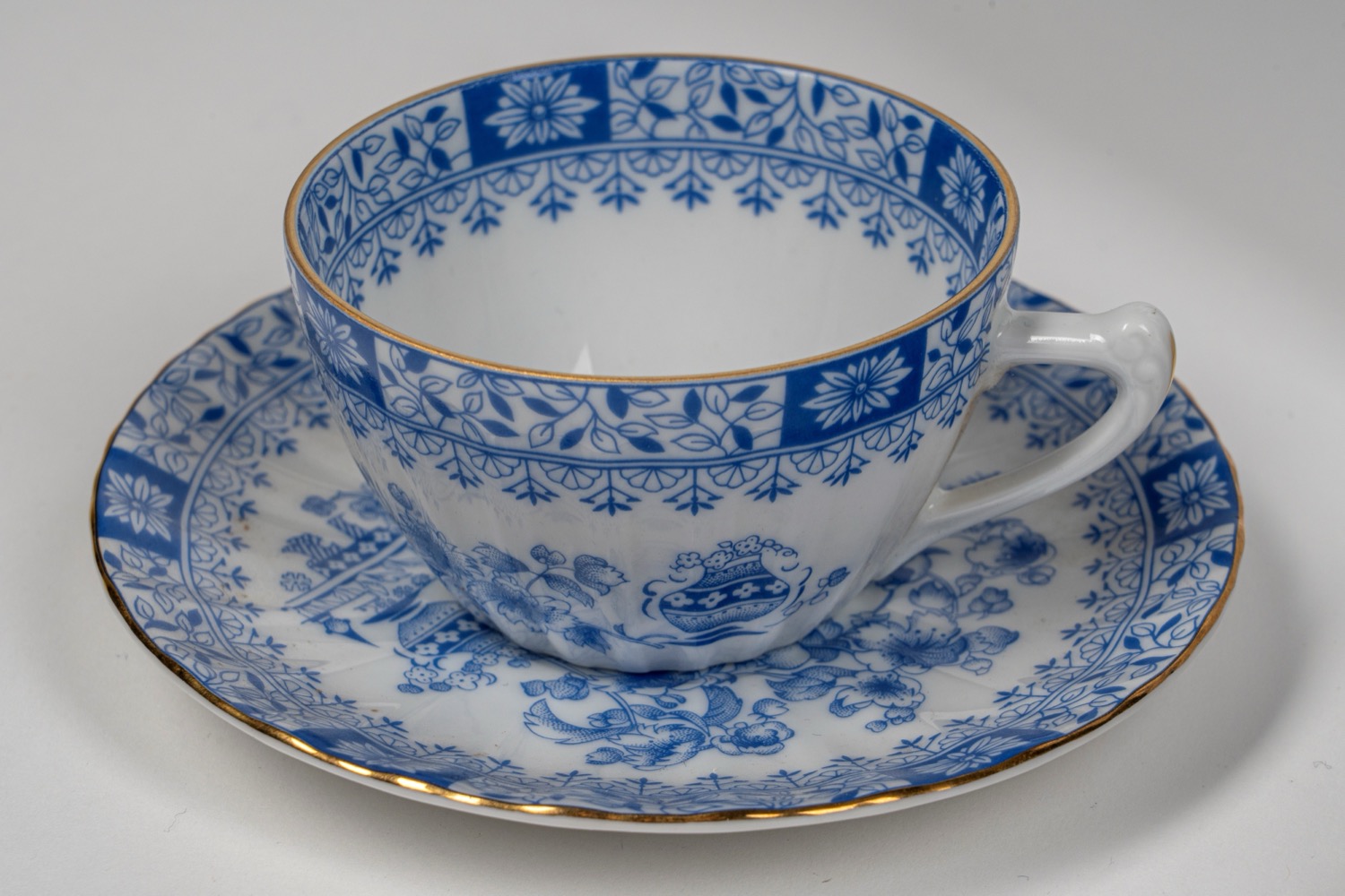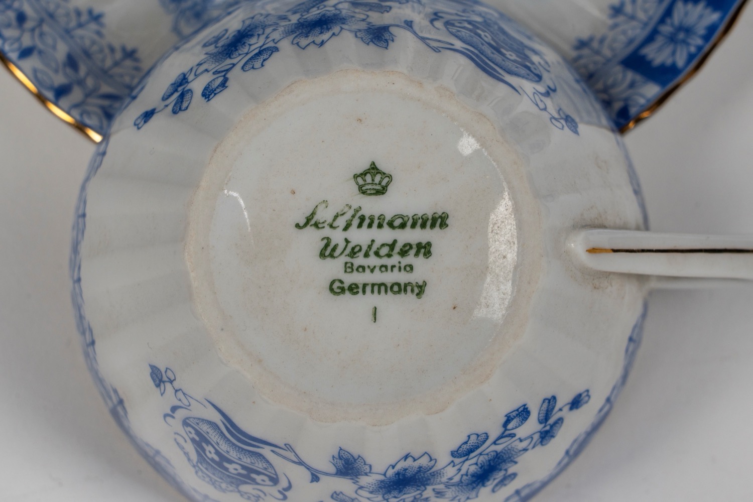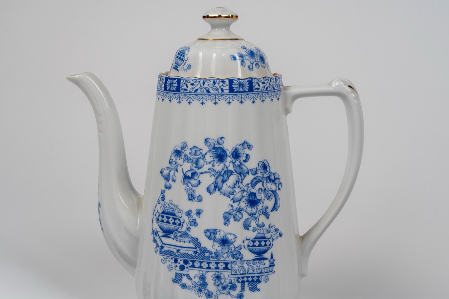 Servizio da caffe tete-à-tete in porcellana bianca costolata con profili dorati con decoro all'orientale in blu, Seltmann Weiden, Bavaria Germania