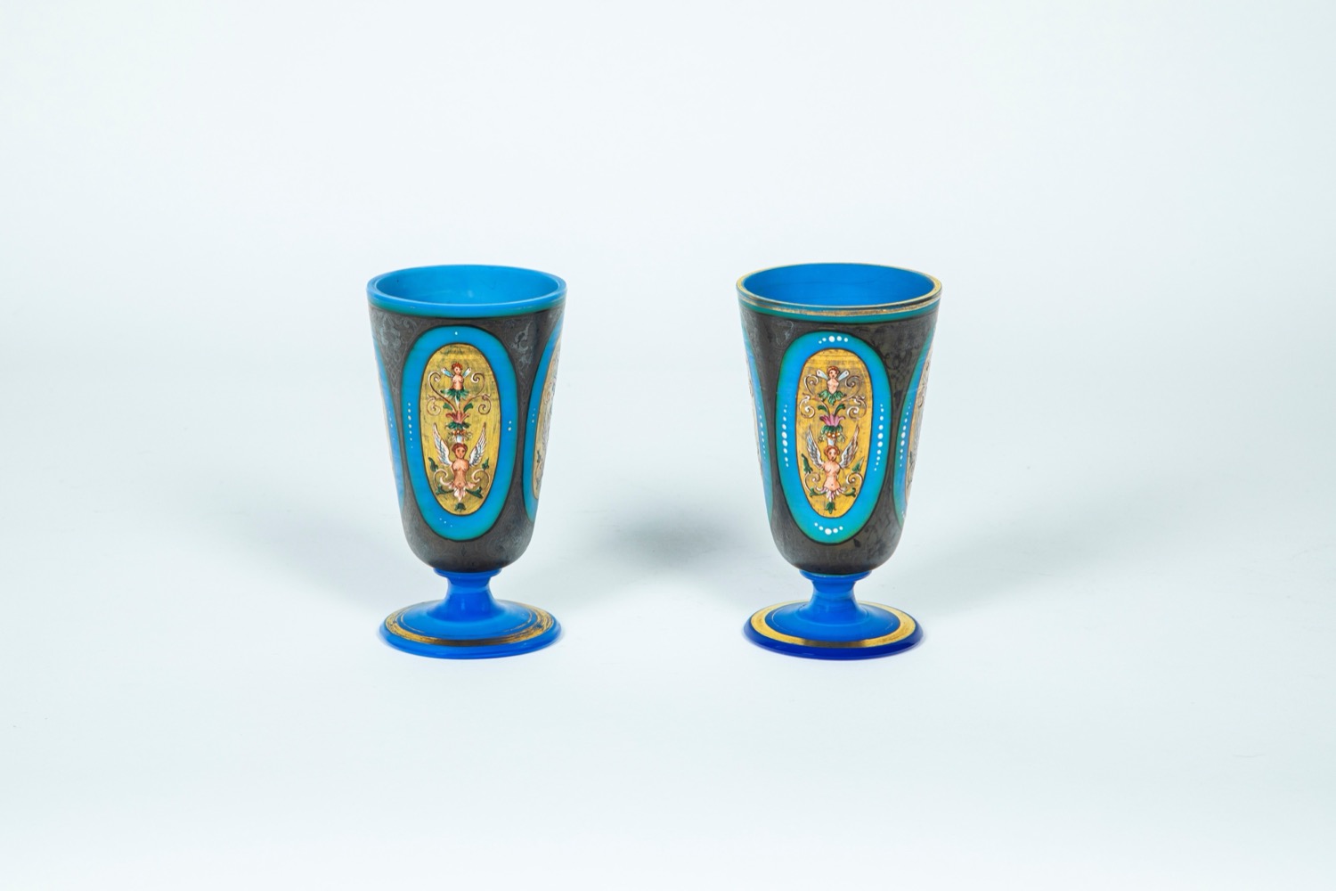 Lot 116 | Coppia di calici in pasta vitrea blu con decoro a mano.
