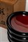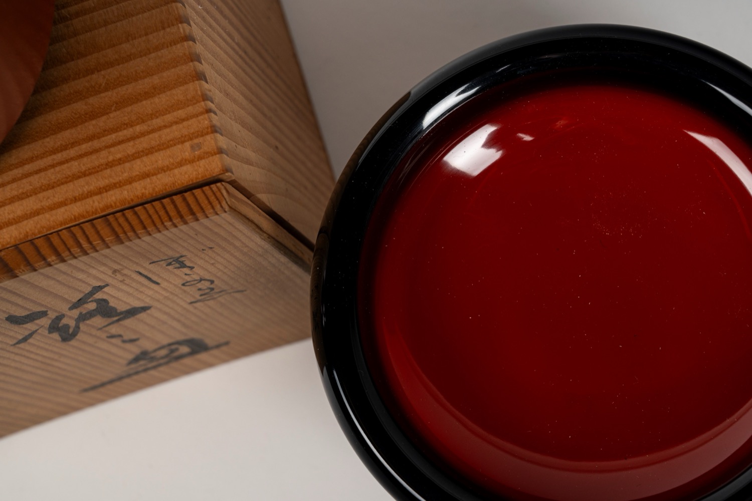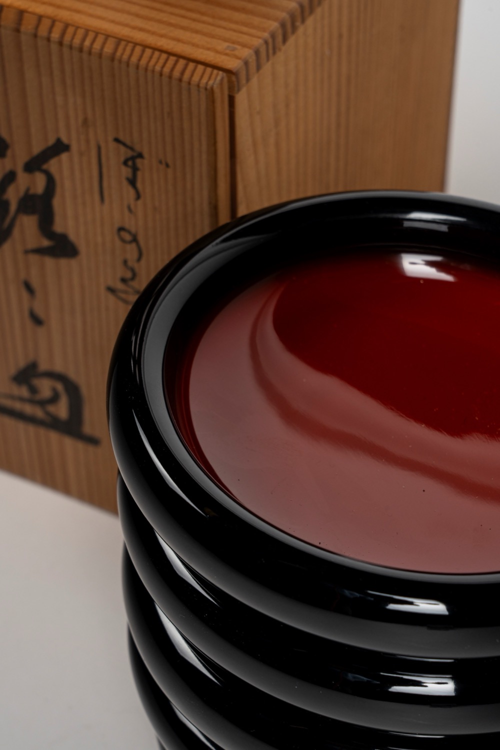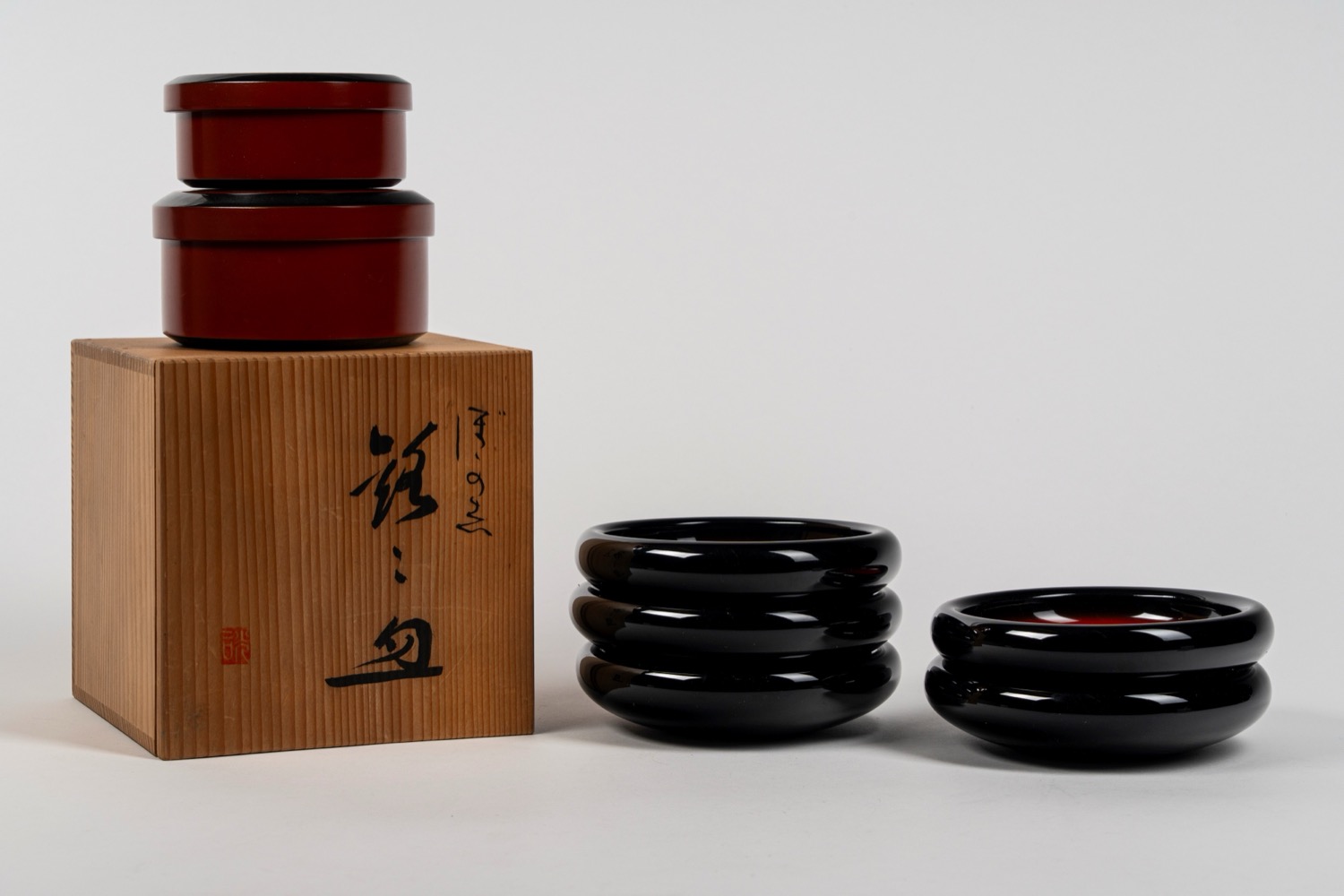 Set di cinque ciotole laccate rosse e nere di manifattura giapponese entro scatola in legno più due scatole laccate rosso nere a matriosca