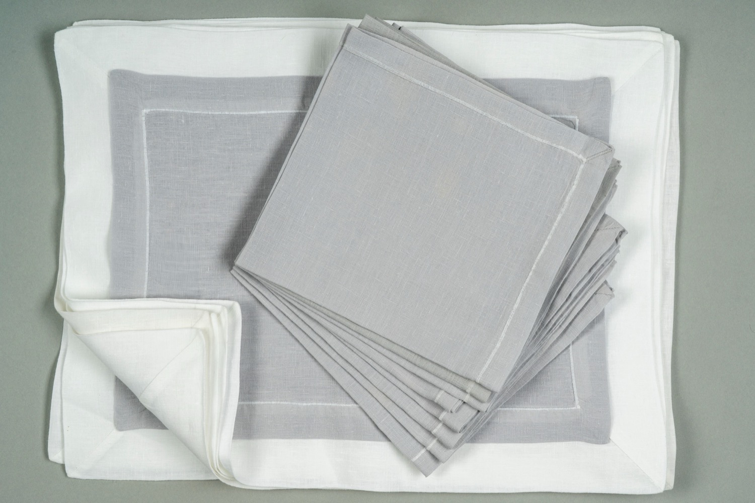 Otto tovagliette all'americana in lino color ghiaccio con bordura bianca con otto tovaglioli color ghiaccio, Marinette, Saint Tropez