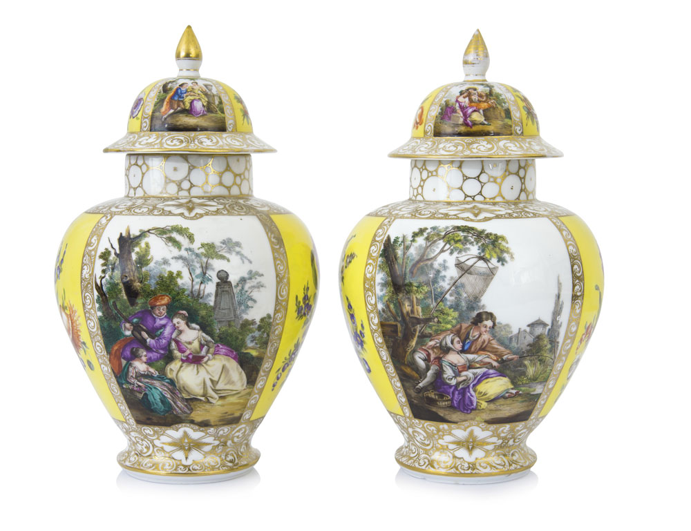 COPPIA DI VASI CON COPERCHIO IN PORCELLANA, DRESDA, XIX SECOLO, ovoidali con decori policromi e in oro entro riserve a scene galanti entro paesaggio alternate a motivi floreali su fondo giallo.