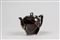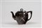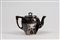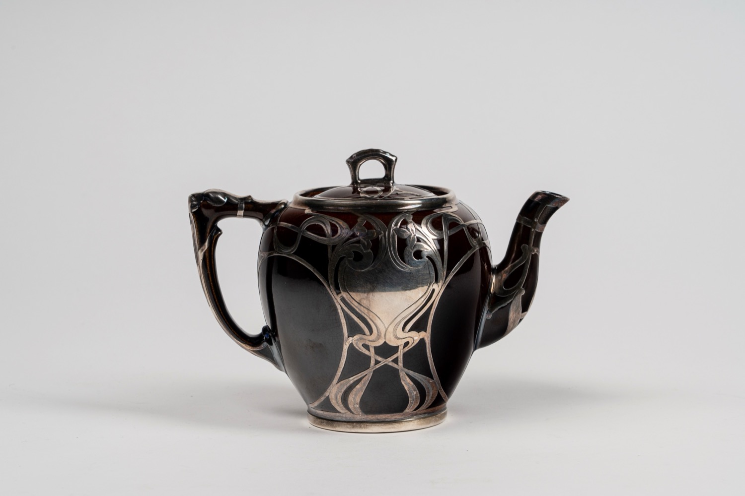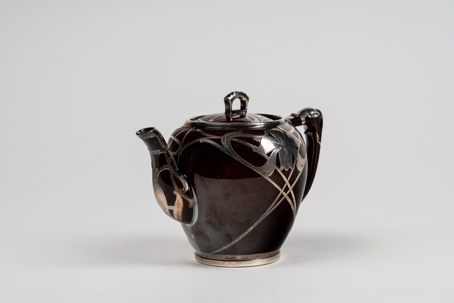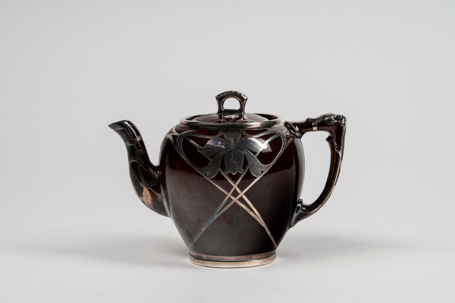 Manifattura inizio secolo XX, Teiera in ceramica con corpo bombato a fondo monocromo decorata con applicazioni di gusto liberty in argento