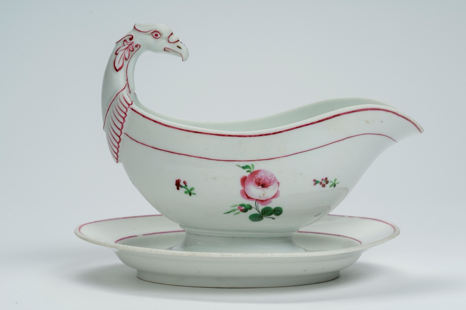 Salsiera a barca con presa a testa di cigno e vassoietto ovale in porcellana decorata “alla rosa” e a fiori sparsi con filetti nei toni del porpora. Germania, Schlagenwal, 1810 circa.