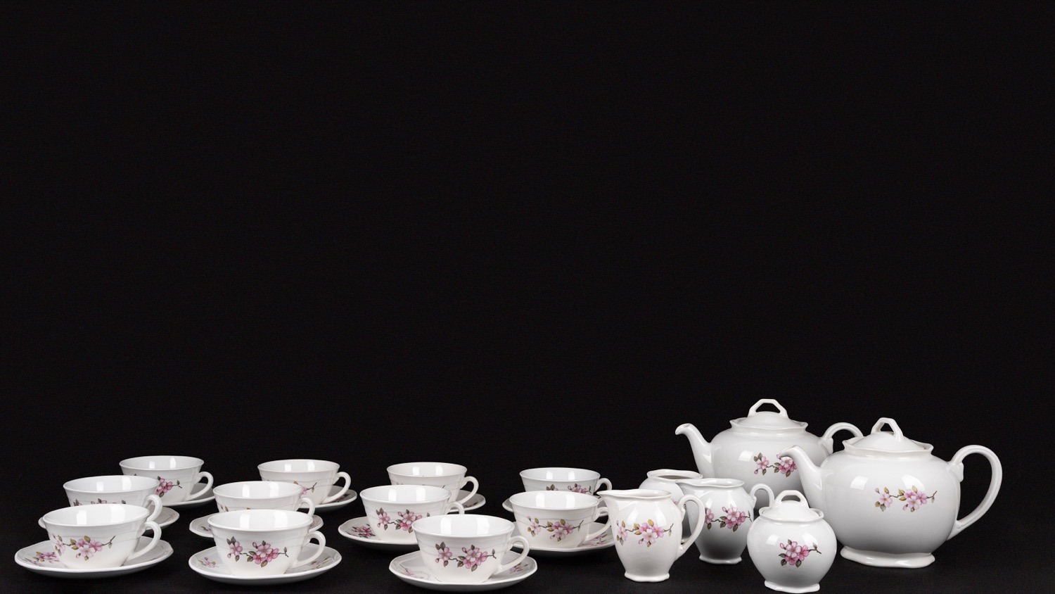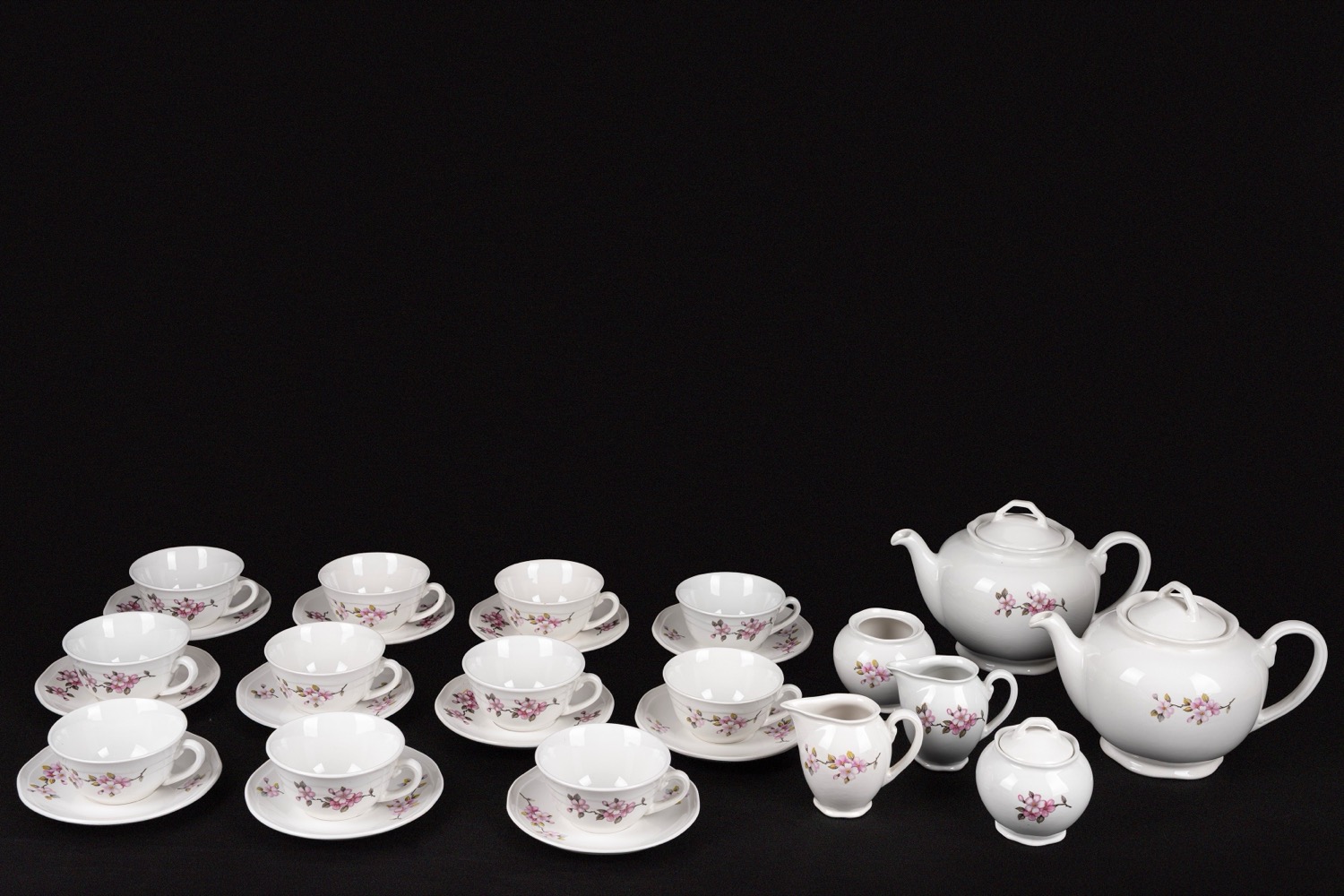 composto da: 11 tazzine, 12 piattini, 2 teiere, due lattiere, due zuccheriere (di cui una senza coperchio)